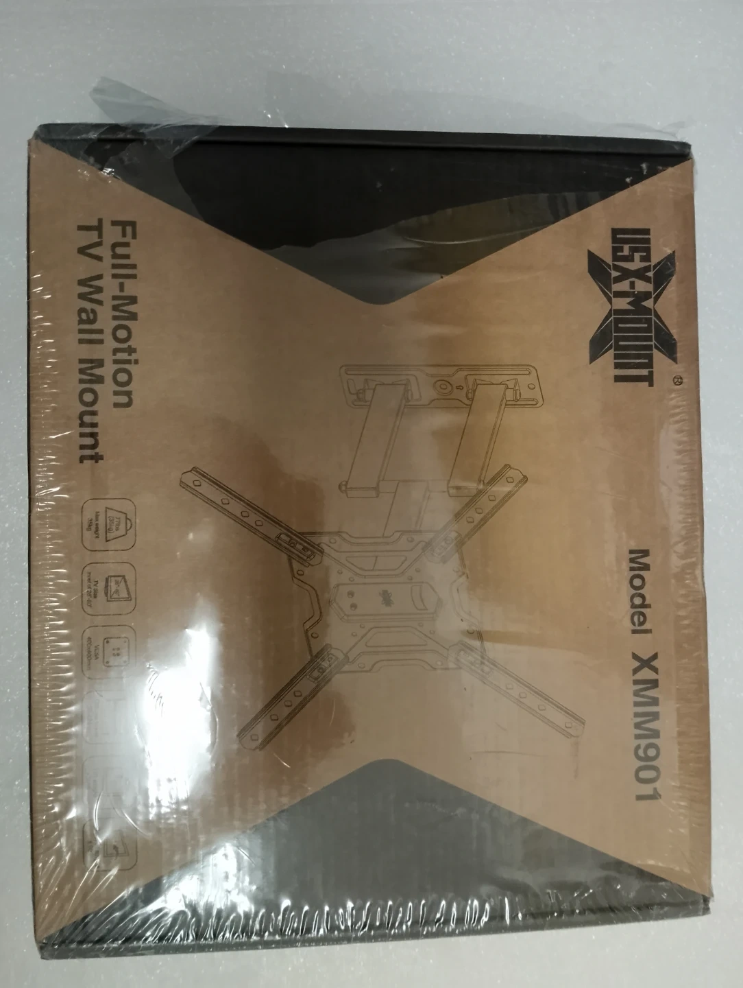 Selling a USX-Mount full-motion TV wall mount, model XMM901. This mount fits various VESA hole patterns, including 75x75mm, 100x100mm, 100x150mm, 150x100mm, 150x150mm, 200x100mm, 200x200mm, 300x200mm, 300x300mm, 400x200mm, 400x300mm, and 400x400mm. The box is included.