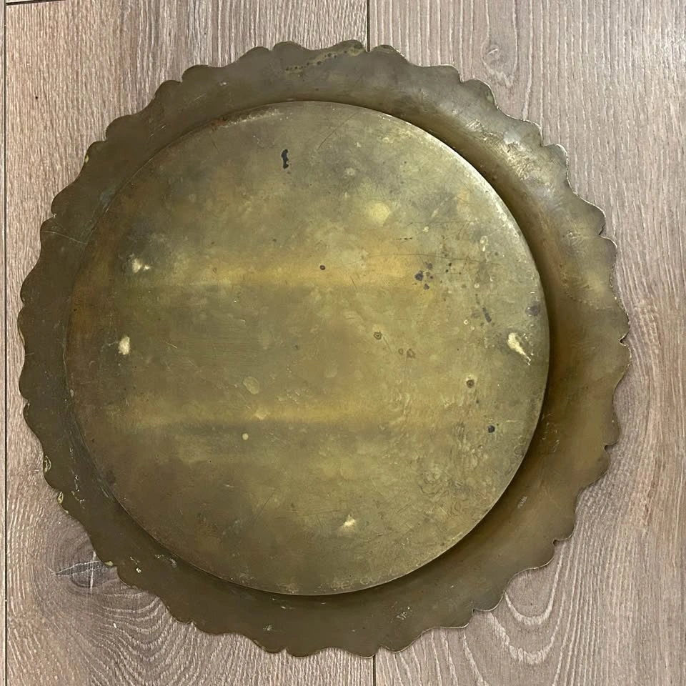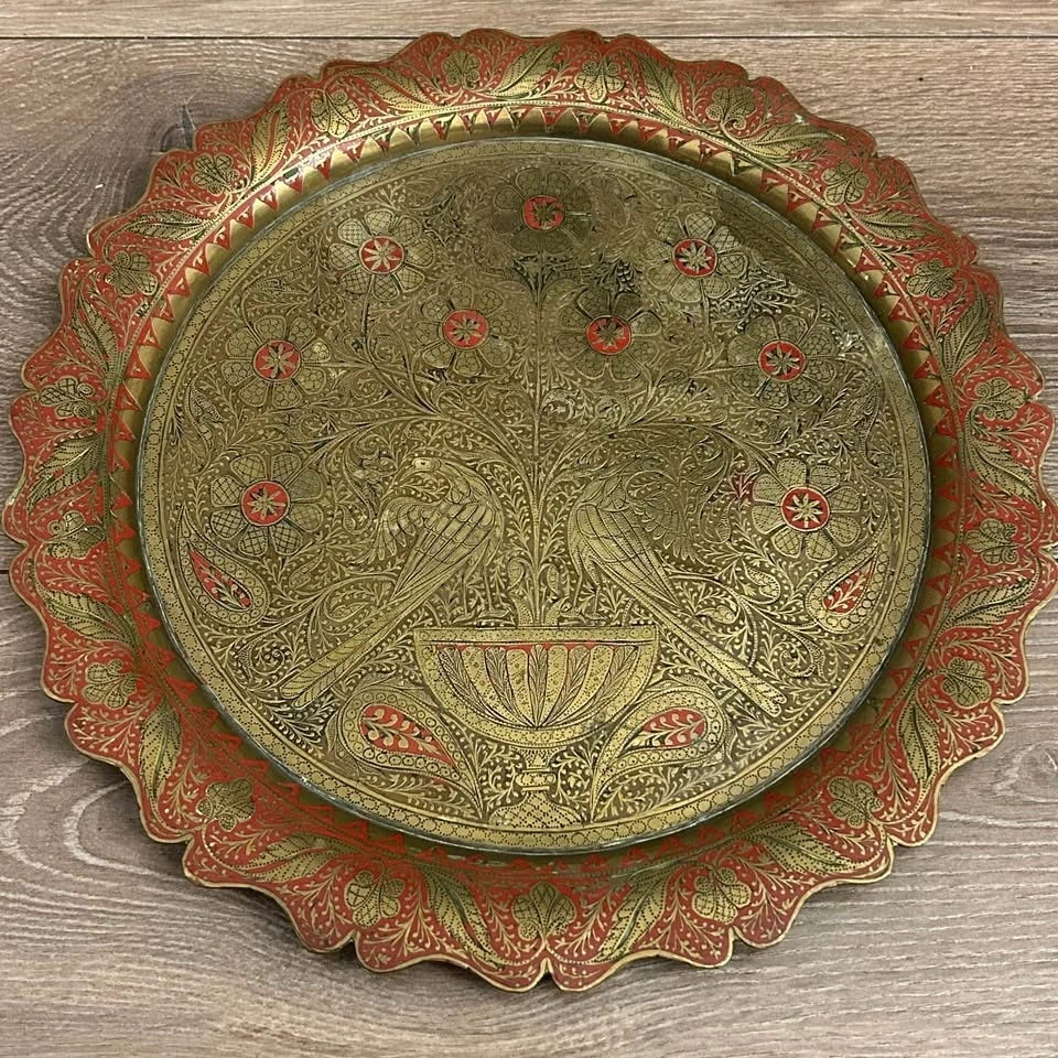 Beautiful vintage solid brass tray or wall plaque featuring hand-etched Indo-Persian-inspired artistry. The centerpiece depicts two elegant peacocks flanking a floral urn, surrounded by intricate scrolling vines and accented with vibrant red enamel details. The decorative scalloped “pie crust” rim enhances its ornate appeal, while the heavy solid brass construction ensures durability and presence. The reverse displays a warm, natural patina, while the front remains bright with only minor wear consistent with age. Versatile for display: can be used as a decorative serving tray, coffee table centerpiece, or mounted on the wall (requires a plate hanger). An ideal statement piece for Bohemian, Eclectic, or Mid-Century inspired interiors. Pick up in the Seton area, Calgary. Cash and e-transfers accepted. Please take a close look at the photos as these are not new items. Feel free to message if you have any questions!