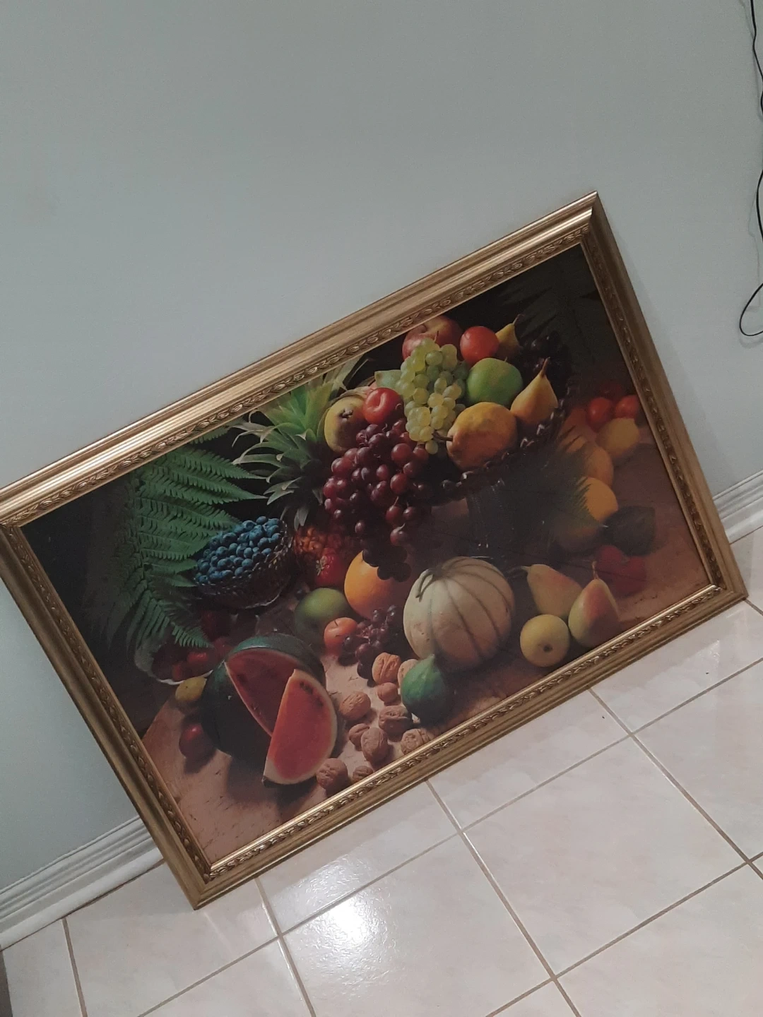This is a framed still life picture featuring a bountiful arrangement of fruits. It's matted and housed in a decorative gold-tone frame. It's ready to add a touch of classic art to your home!