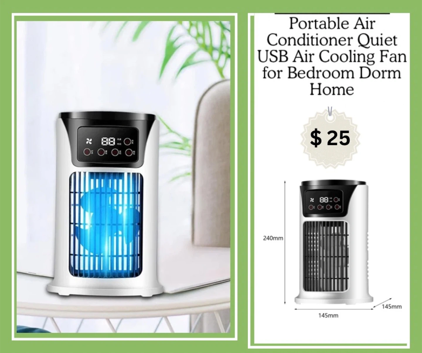 not working It's a portable air conditioner quiet USB air cooling fan for bedroom, dorm or home. Dimensions are 240mm high by 145mm wide and 145mm deep. This fan is great for personal cooling!