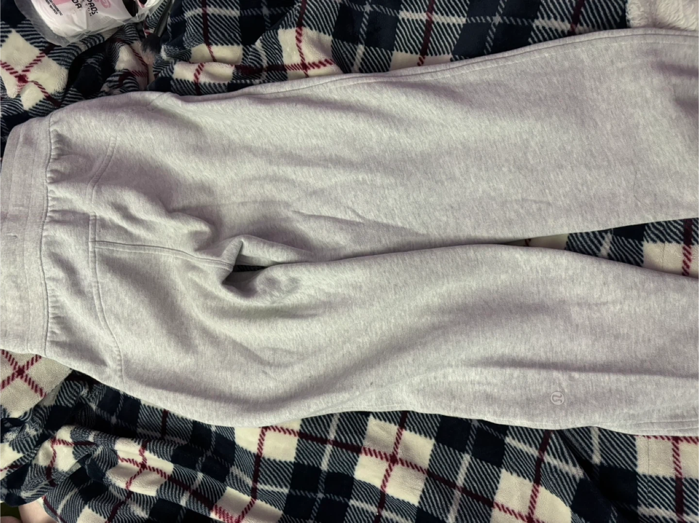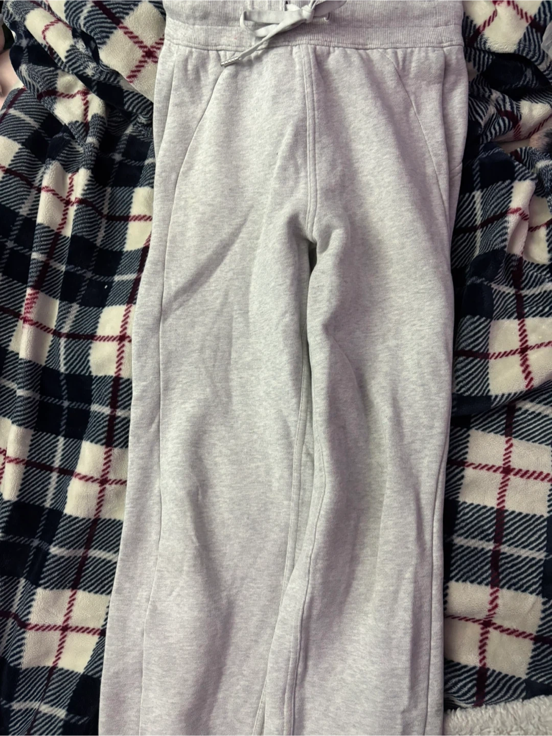 Selling a pair of Lululemon high-rise 7/8 scuba joggers in a light grey colour! They are a size 2.