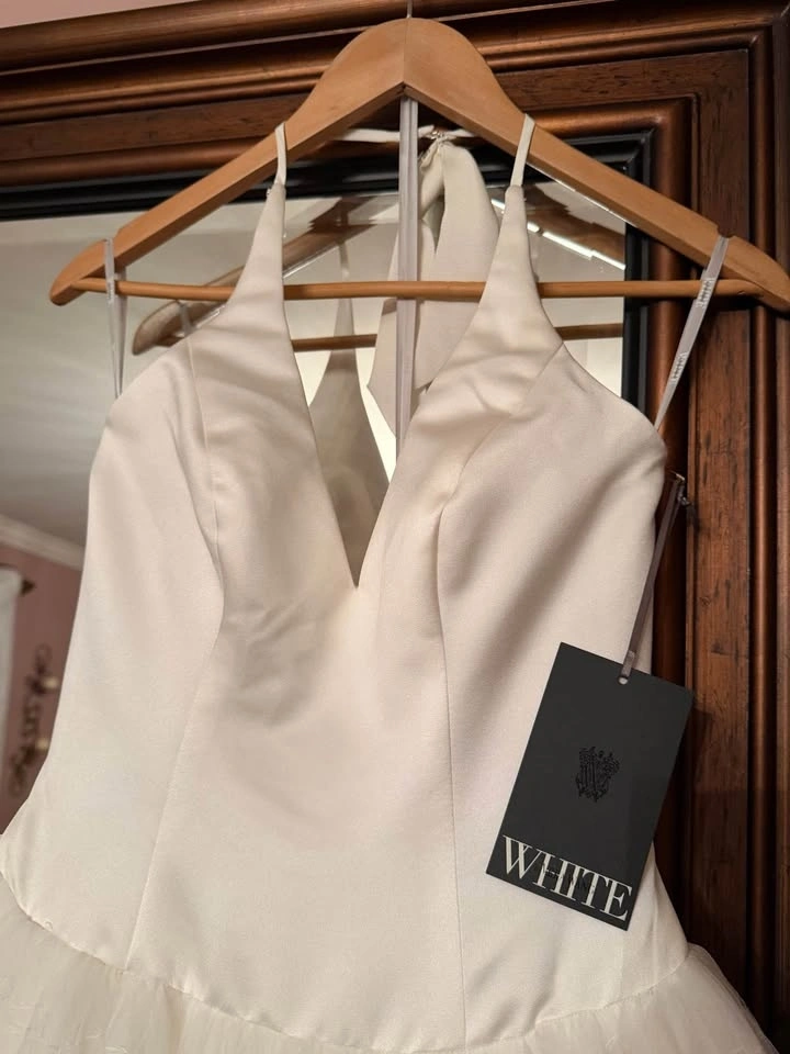Gorgeous, brand new, Vera Wang halter neck wedding gown with button detail on back. Size 2, ivory. Features a full skirt and train of tulle. Never been worn, tags attached. Originally $1400.