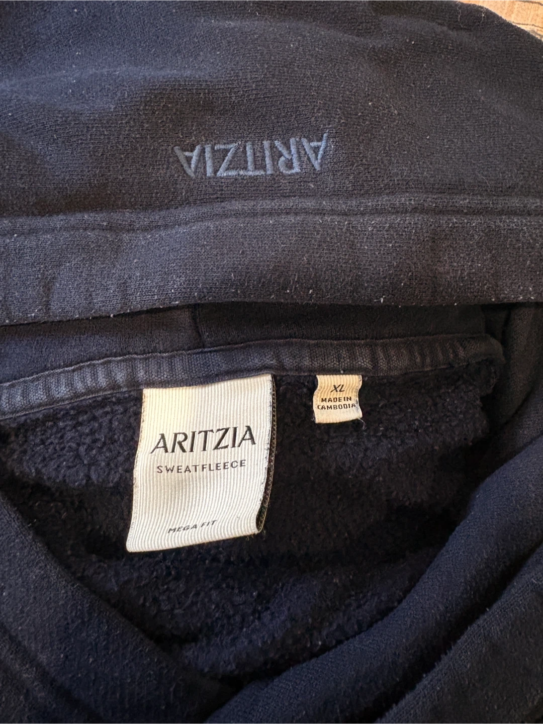 Admiral Aritzia hoodie made with sweatfleece. It's a size XL and was made in Cambodia. This comfortable hoodie is perfect for layering on cooler days.