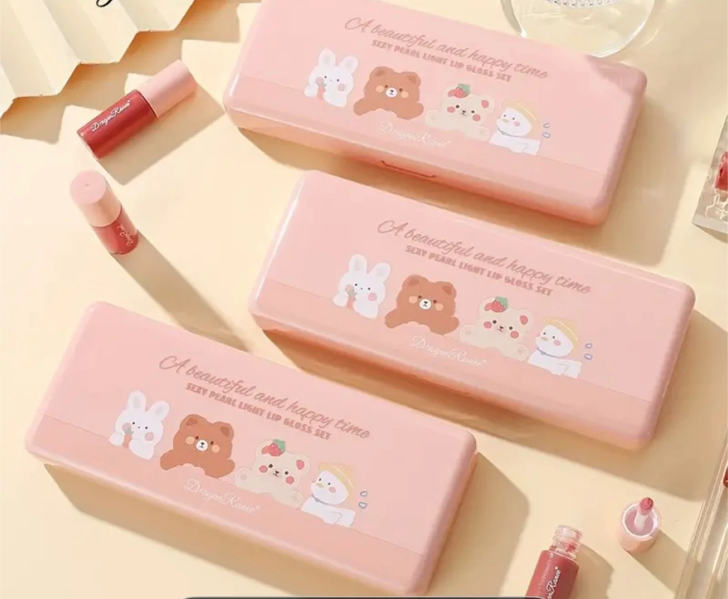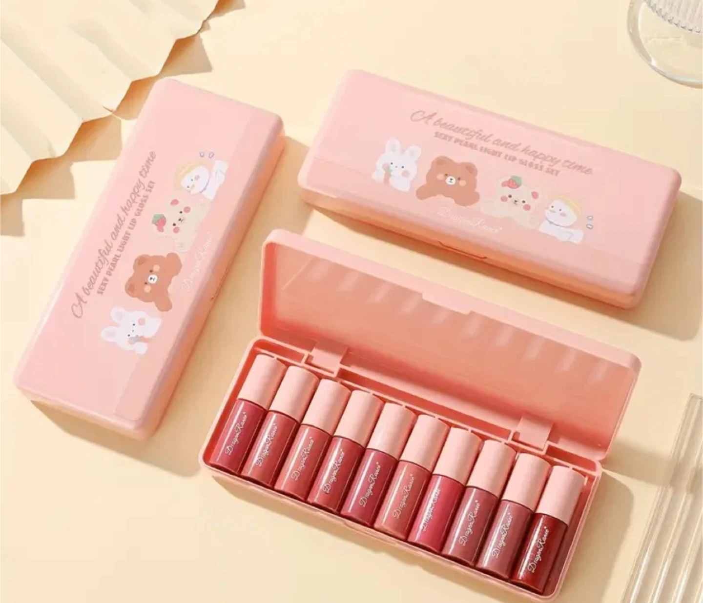 This is a set of 10 lip glosses in a pink case. The case has cute bear and bunny designs. It's a nice gift for makeup lovers.