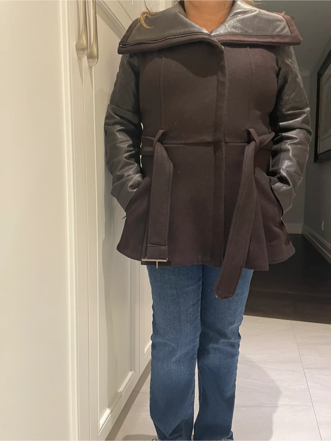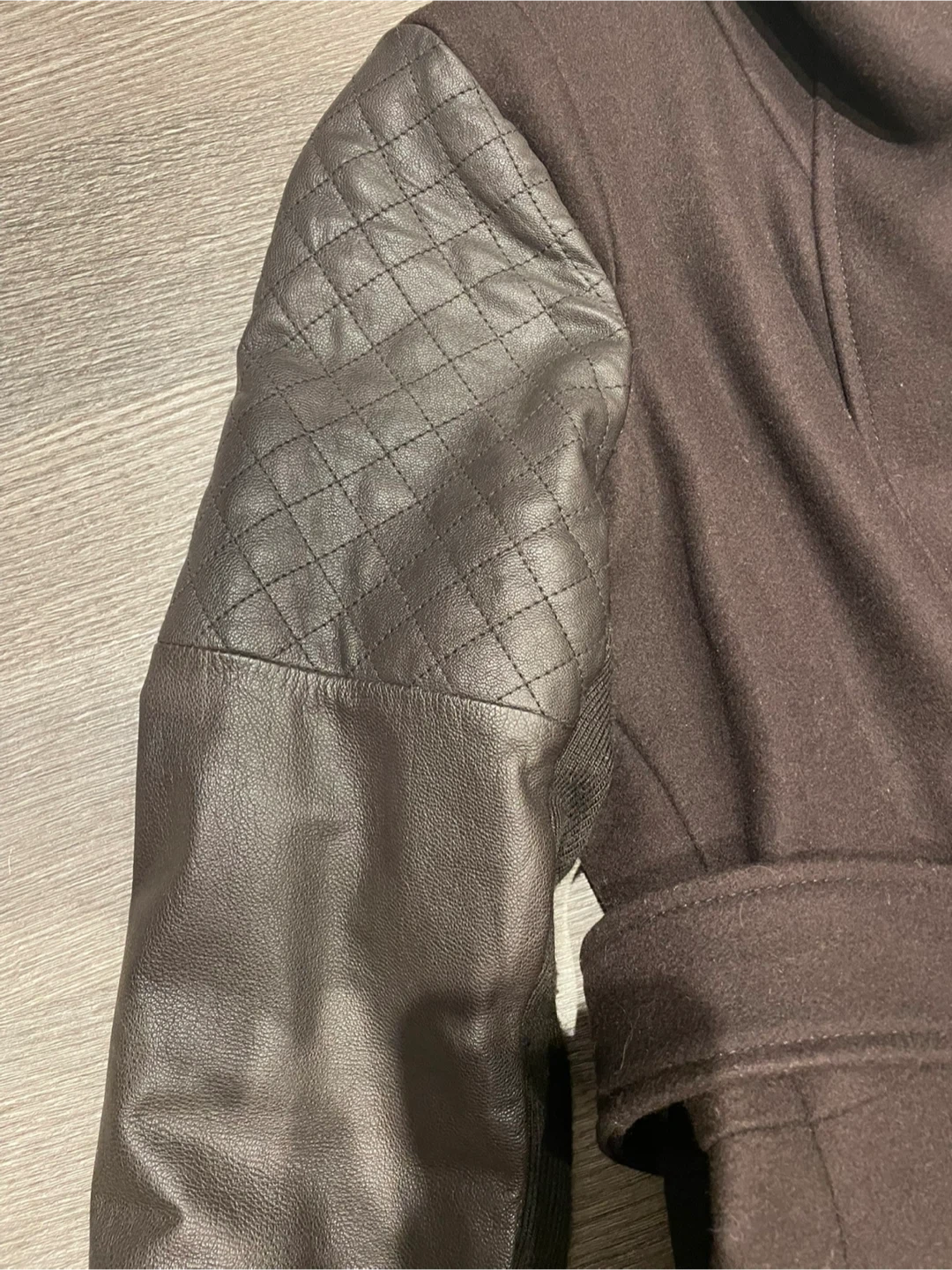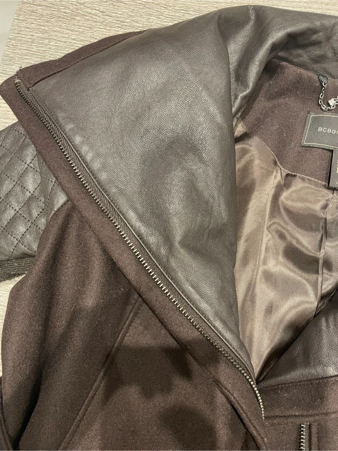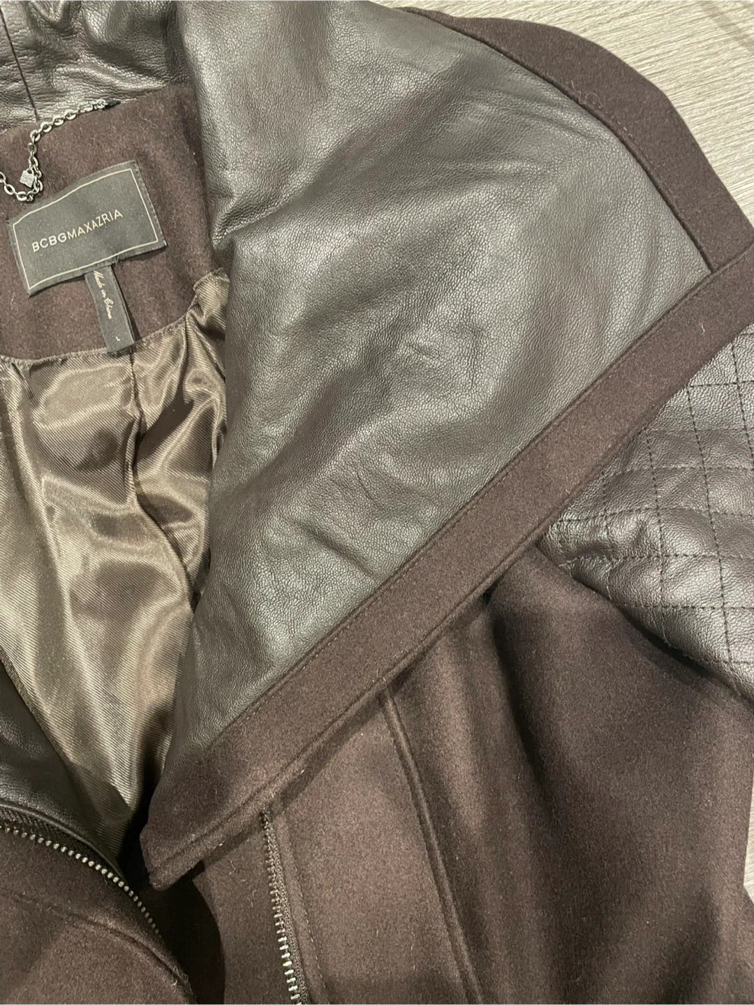 Brown BCBGMAXAZRIA jacket with real leather sleeves and wool blend body. Features a zippered pocket and a stylish quilted detail on the shoulders.