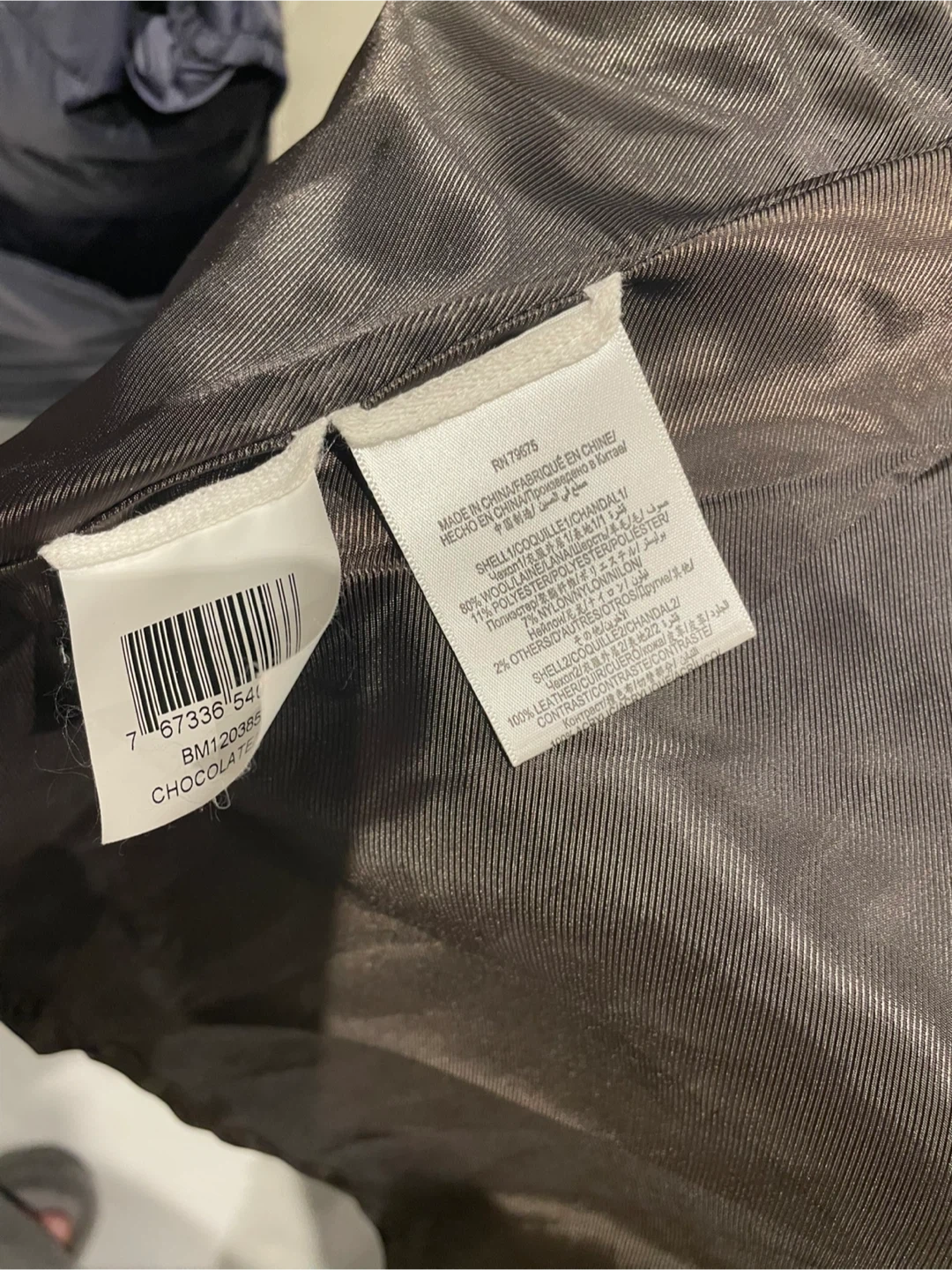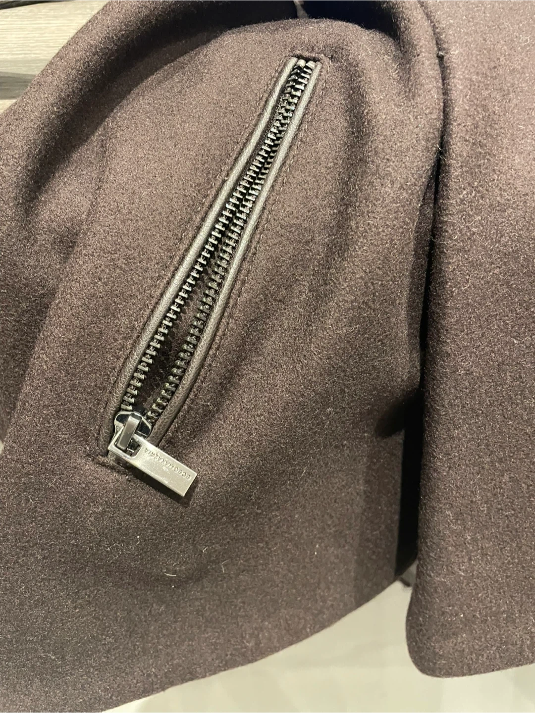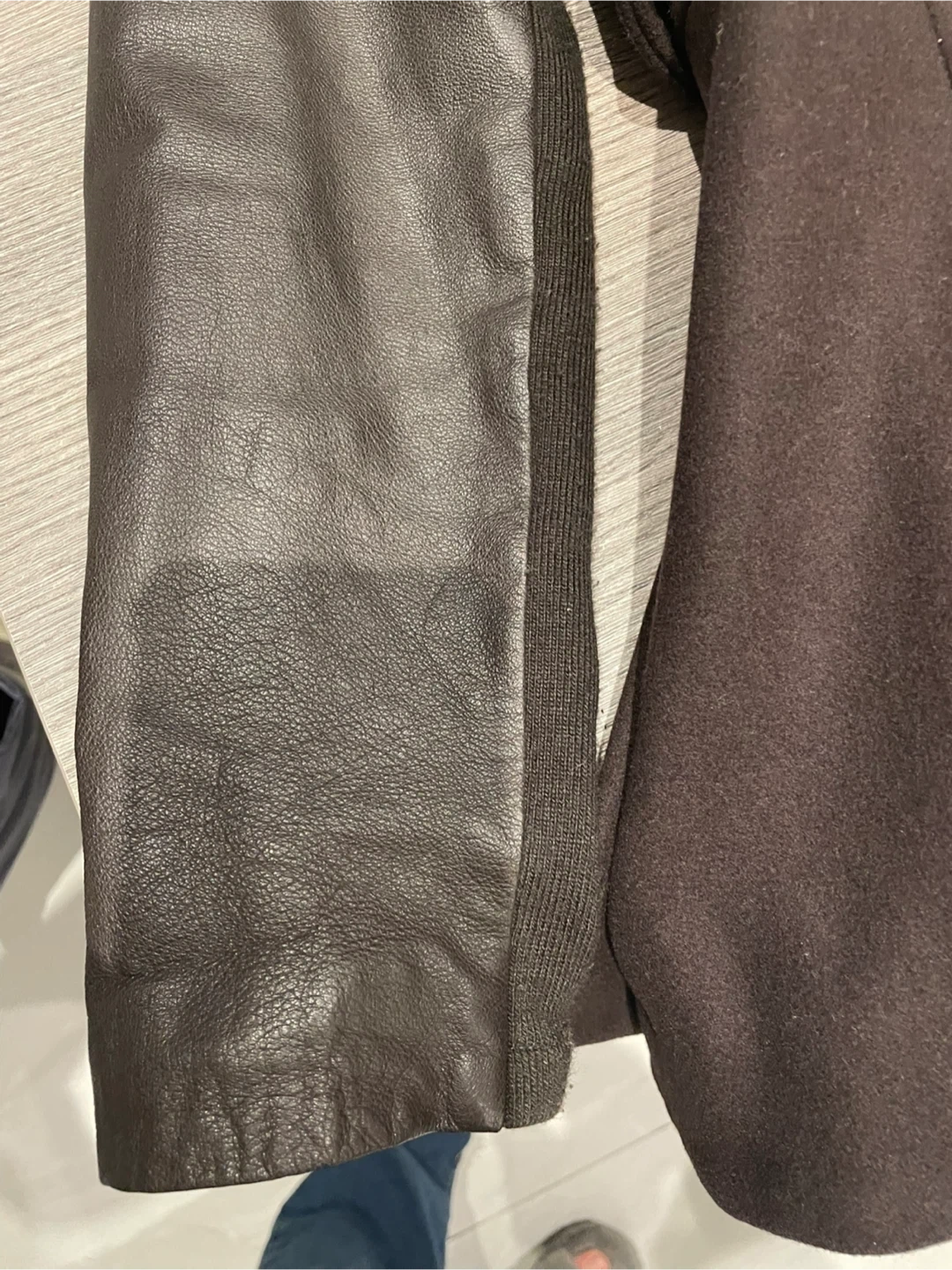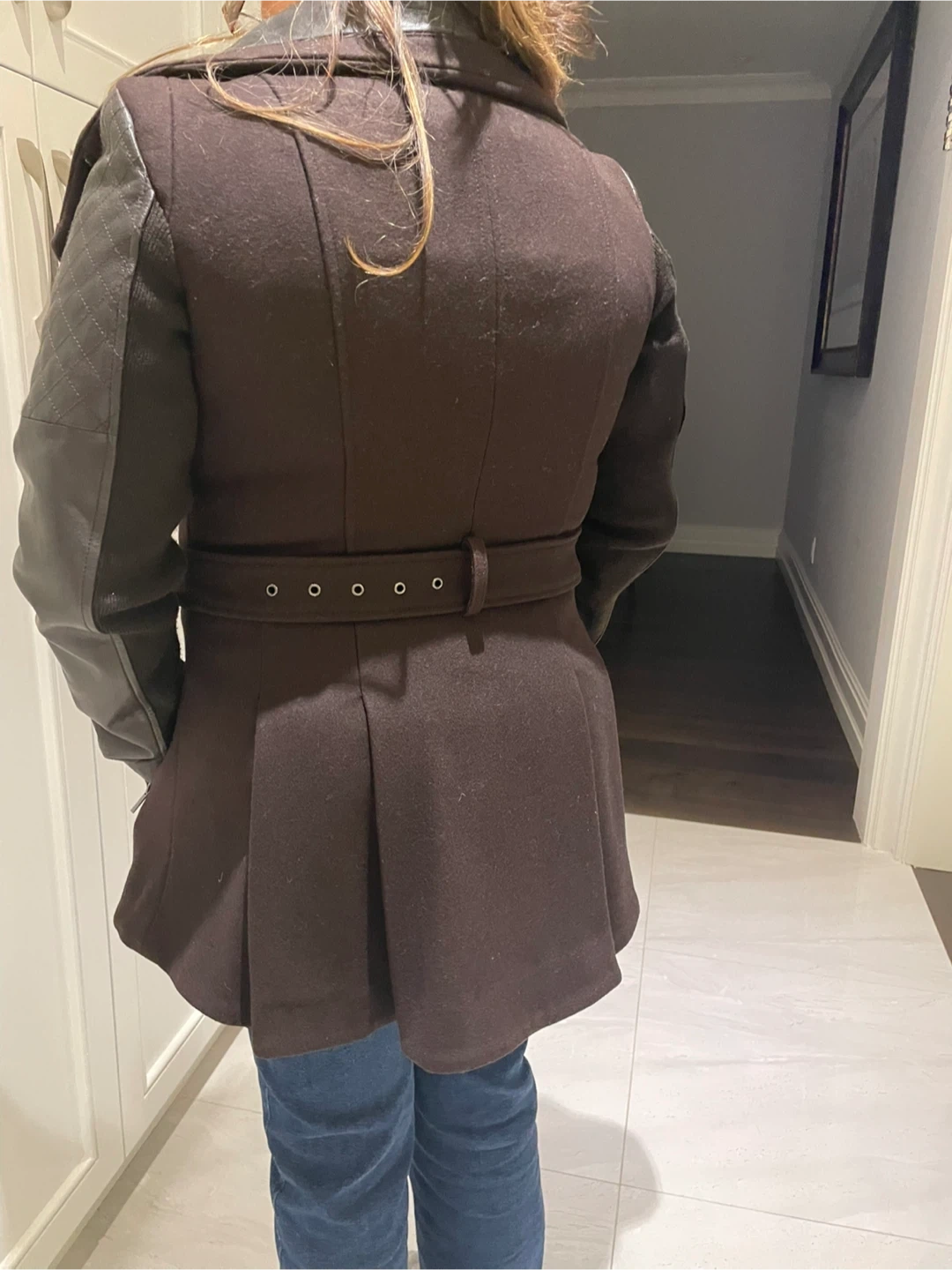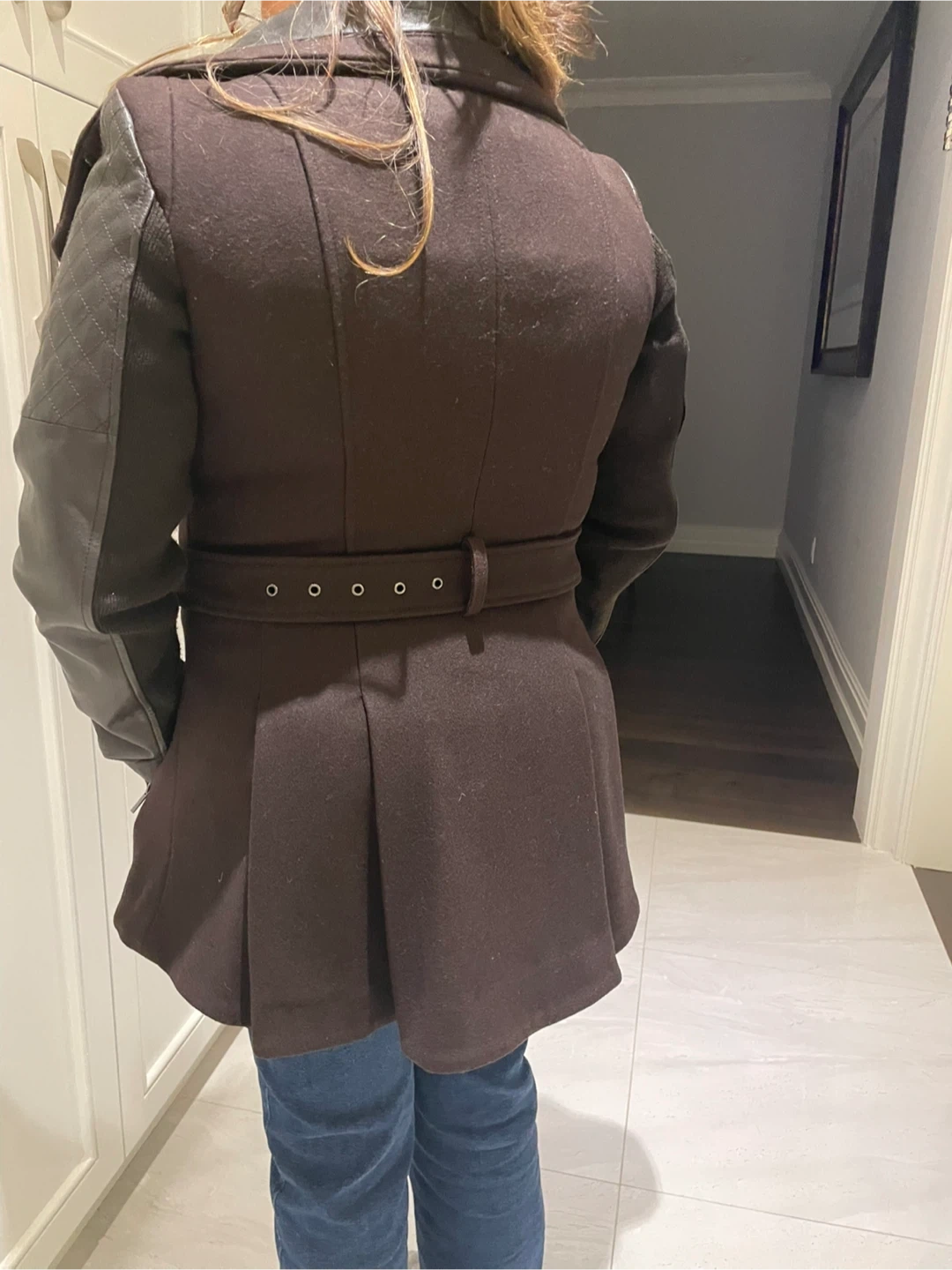 Brown BCBGMAXAZRIA jacket with real leather sleeves and wool blend body. Features a zippered pocket and a stylish quilted detail on the shoulders.