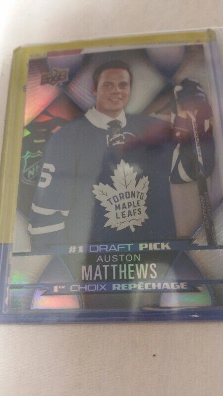 2016-17 Auston Matthews Upper Deck Tim Hortons #1 Draft Pick DP-1 Redemption Rookie Mint. I NEVER TOOK IT OUT OF THE PLASTIC IN CAME IN THE CARD SHOULD BE A 10 GRADE THE LAST PHOTO OF THE BACK OF THE CARD WAS COPIED FROM THE WEB .MINE CARD AS THE COM.C CARD COVERING THE BACK OF THE CARD The card pictured is the exact card you will receive. This is one of Matthews rarest rookies CARD. Let me know if you're interested!