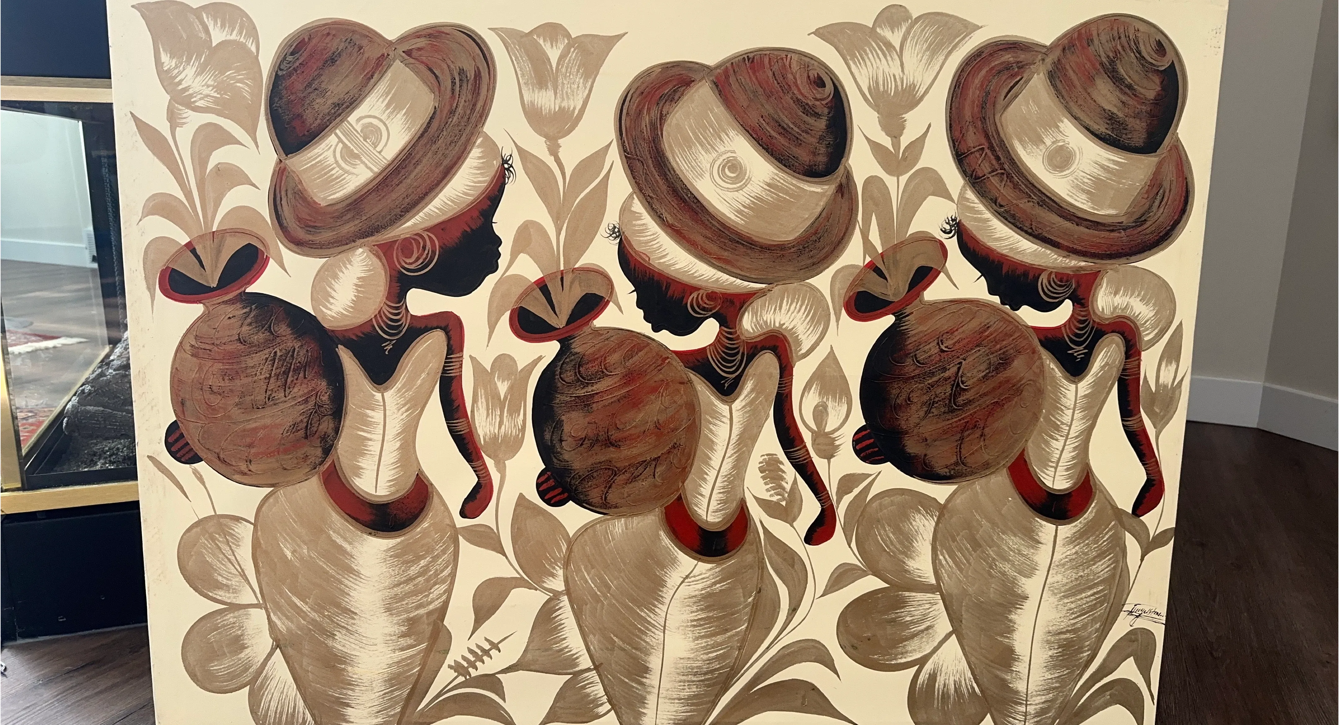 This striking vintage painting depicts three African women carrying water jugs. The art features a unique colour palette of browns, creams, and reds. It's a beautiful piece that adds character to any room! Acrylic paint on canvas, and ready to hang with wire.