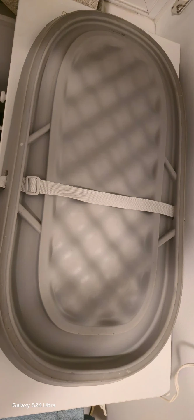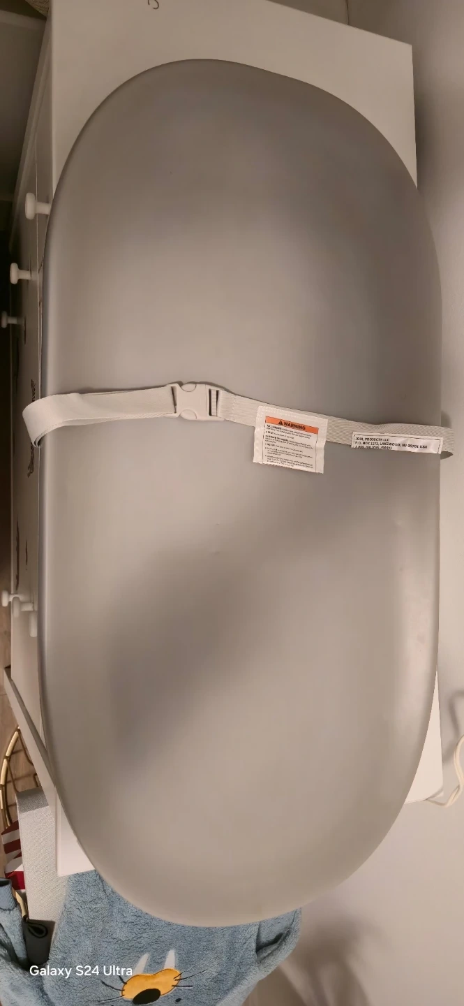This is a grey baby changing pad. It has a safety strap to keep your little one secure. The surface is easy to clean and wipe down.