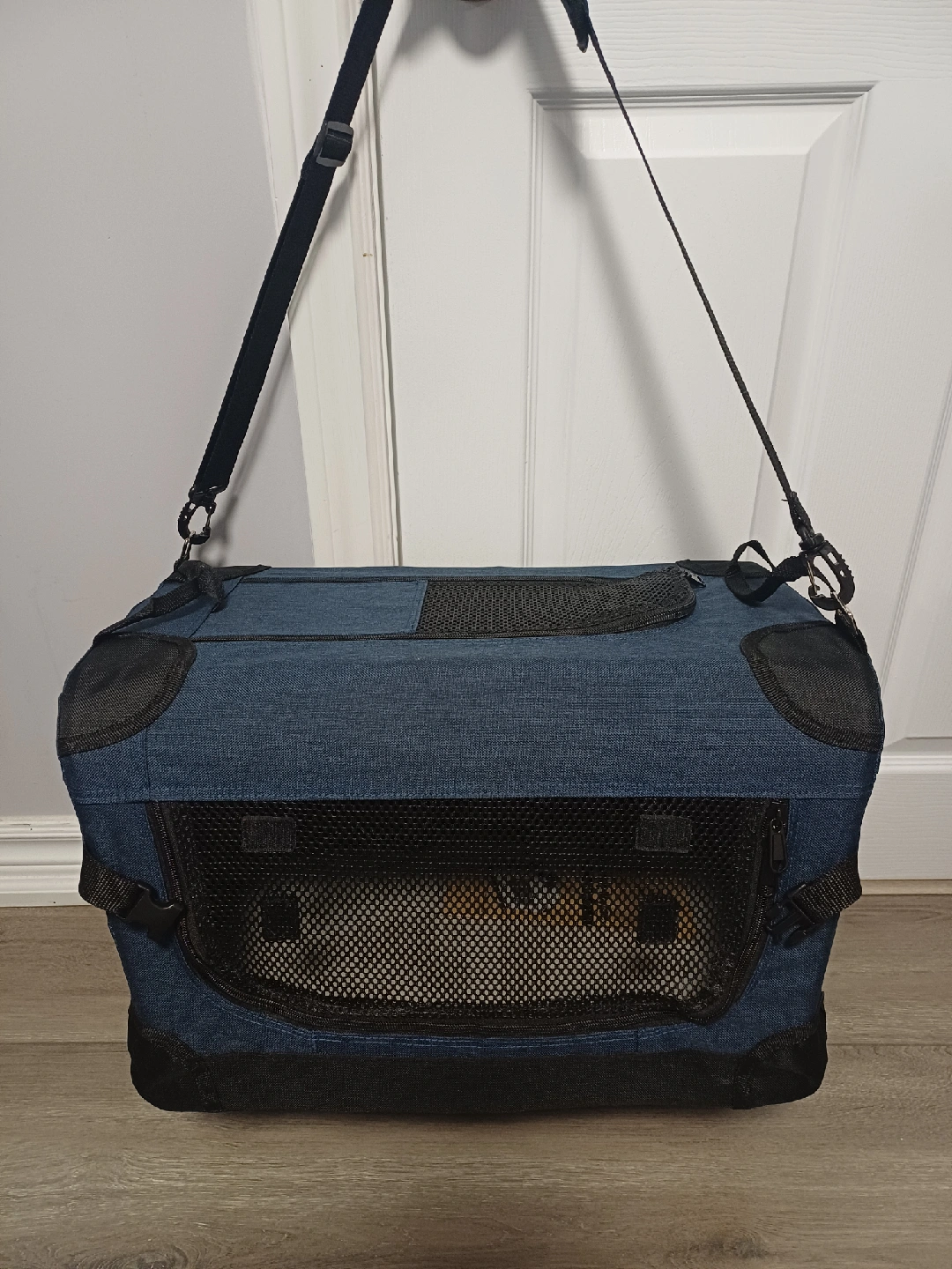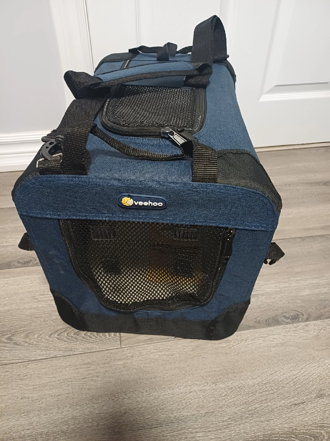 96Selling a Brand new...Never used and a Heavy duty... Veehoo pet carrier/foldable crate carrier in blue. It's in great shape and ready for your furry friend's adventures! Features a mesh windows for visibility and good ventilation. So easy to set-up and fold. Size: 20x13x13 Available in 3 colors: Blue, Brown snd Black