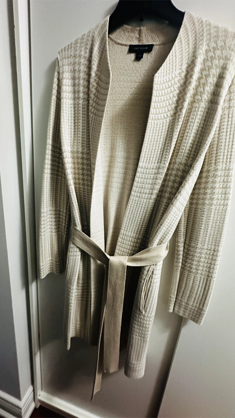 Selling a new Ann Taylor cardigan in size L. It features a beige colour and a stylish belted design. Perfect for layering!
