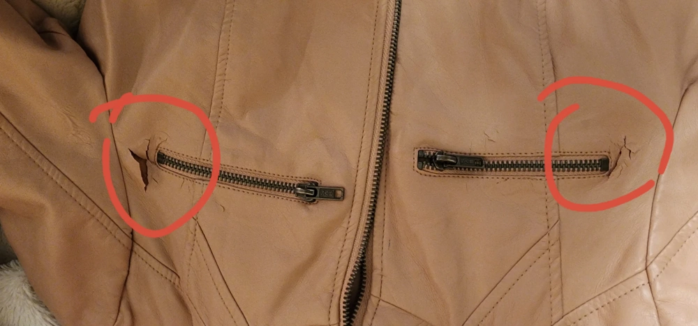 926Faux leather jacket reduced to FREE due to damage next to the side zippers. Maybe it can be smoothed out with a dollop of glue? Not sure.