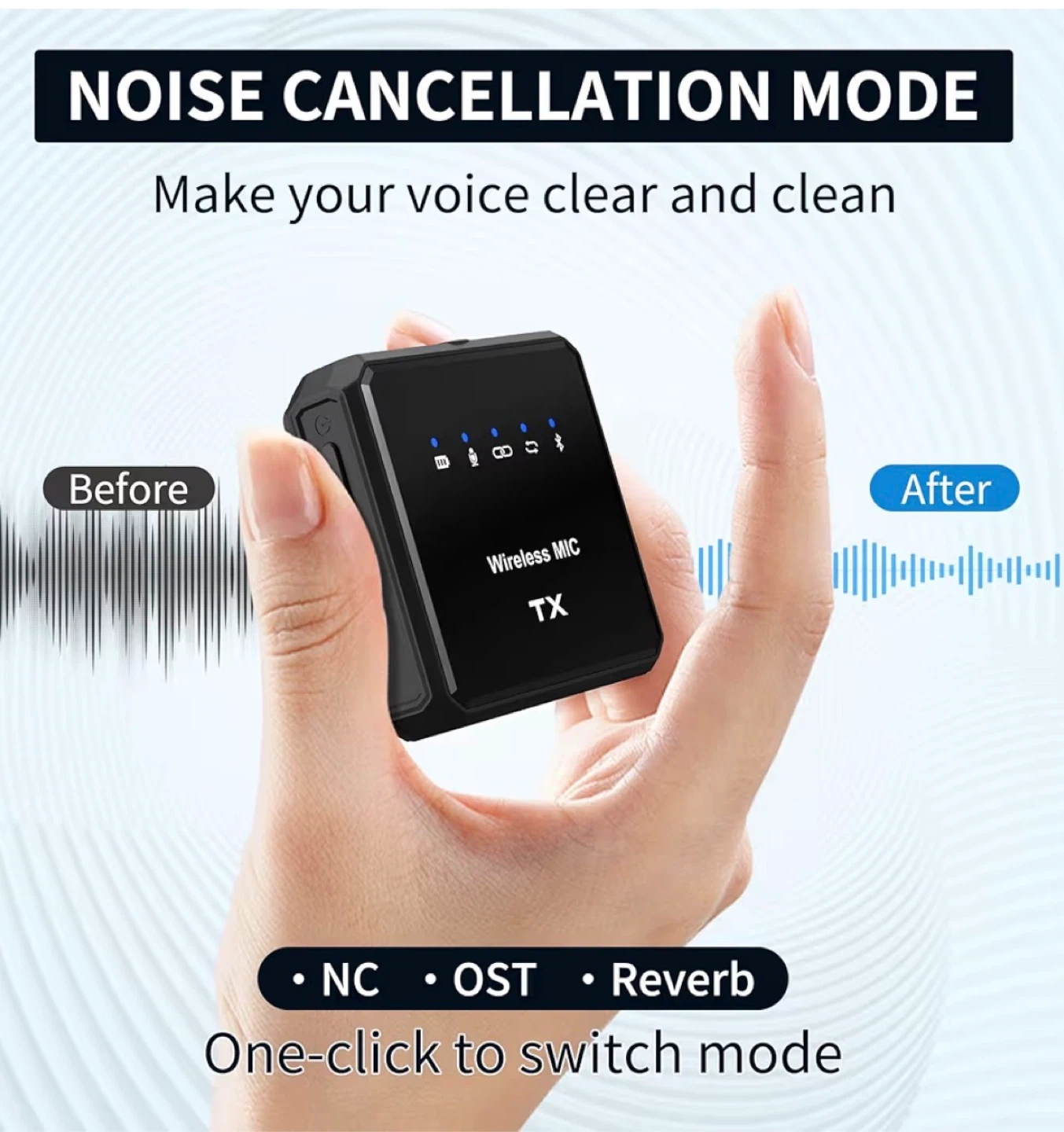 Professional noise cancellation control: Our wireless lavalier microphone is equipped with professional ENC technology. Enhanced firmware and audio algorithms ensure crisp, rich, and distortion-free human voices, even in noisy environments. The lavalier microphone offers three modes: Noise Cancellation, Original Soundtrack, and Reverb. The default setting is Noise Cancellation at startup.