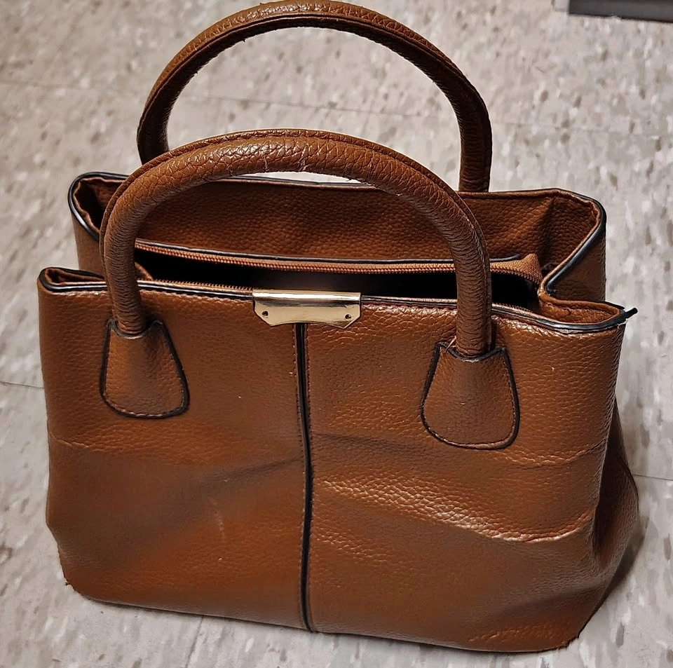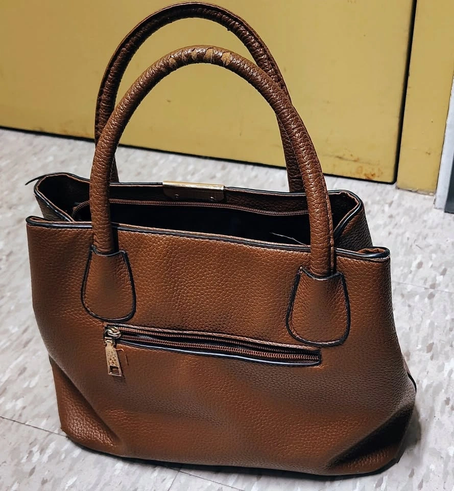 Stylish brown structured handbag with sturdy rounded handles and a classic everyday look. The textured exterior gives it a polished appearance while still being practical for daily use. Inside, the bag is nicely organized with two main sections divided by a zippered middle pouch, plus two additional zippered interior pockets for smaller items like keys, phone, or wallet. Great for keeping everything tidy while you’re out and about.
