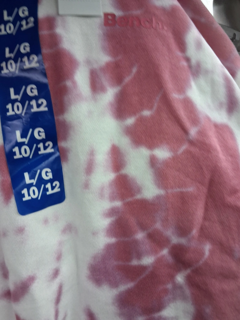 This Bench sweatshirt features a pink and white tie-dye pattern. It's a size L/G, which corresponds to sizes 10-12. The fabric feels soft and comfortable.