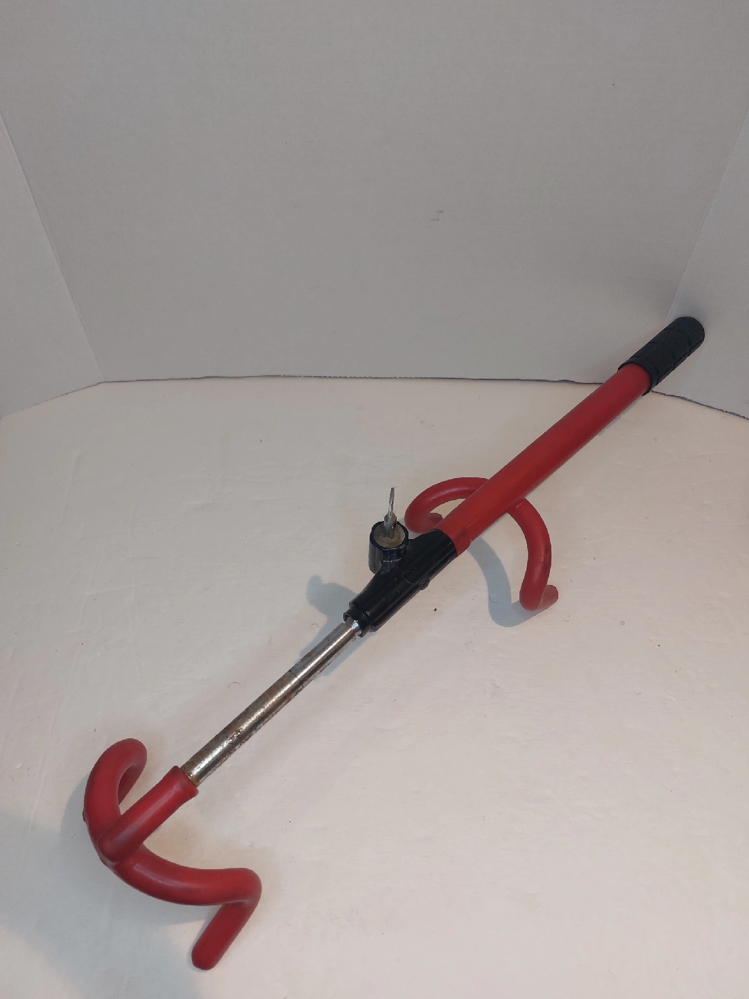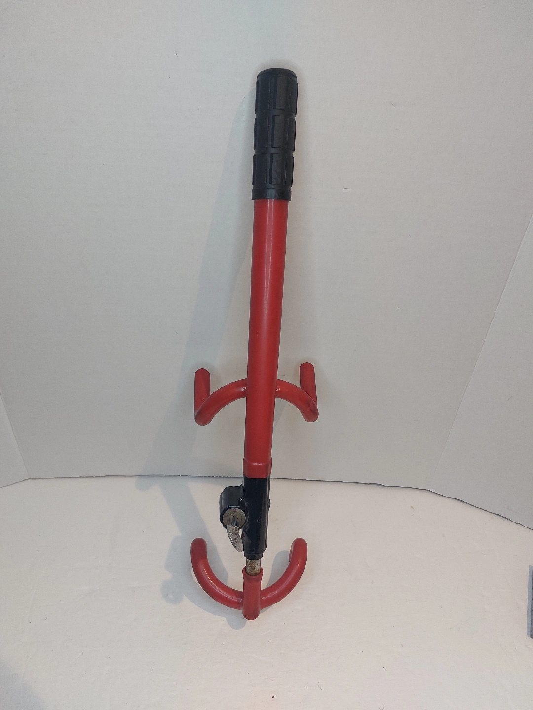 Vehicle Steering Wheel Lock - Red Selling a vehicle steering wheel lock in red. It's in good condition and comes with a key. Protect your car with this easy-to-use device!
