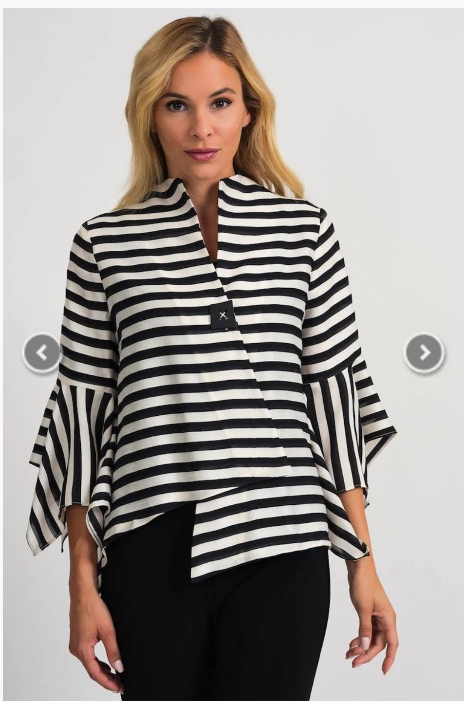 This stylish Joseph Ribkoff jacket features a bold black and white stripe pattern. It has dramatic bell sleeves and a unique button closure.