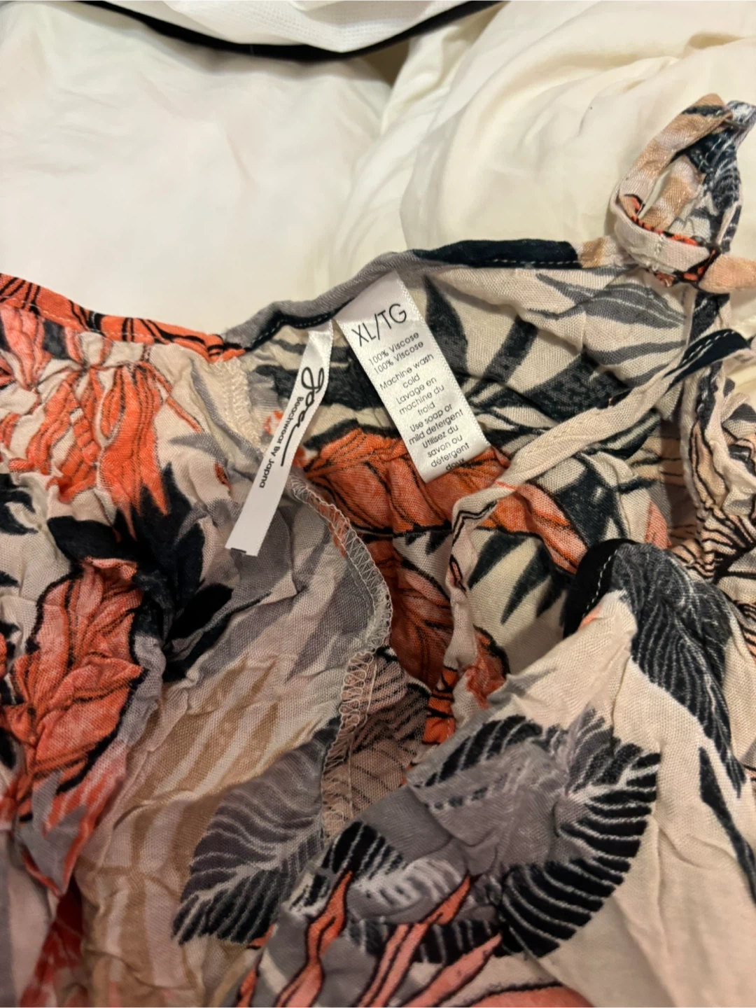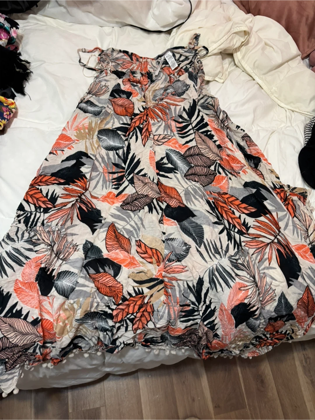 This is a women's maxi dress with a tropical floral print. It's made from 100% viscose fabric. The size is XL/TG. Care instructions: machine wash cold, do not bleach, tumble dry low, iron low heat, use mild soap.