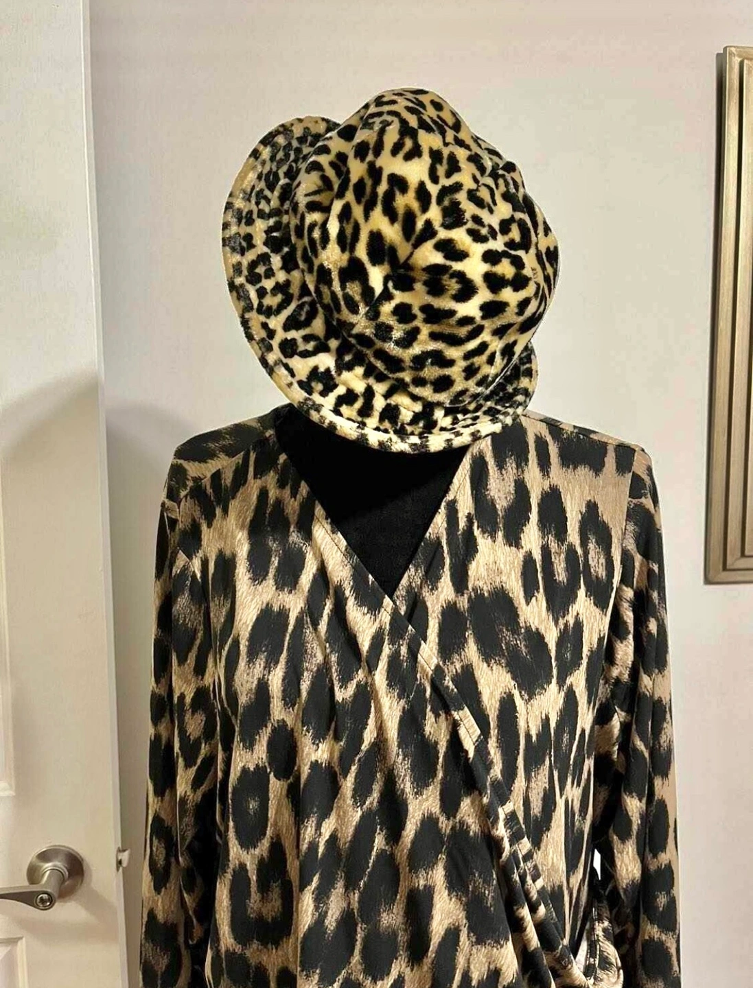 Unique leopard print cloche hat. Soft velvet material. Perfect for adding a touch of vintage flair to your outfit. Great price. ***Dress not included. Sold separately
