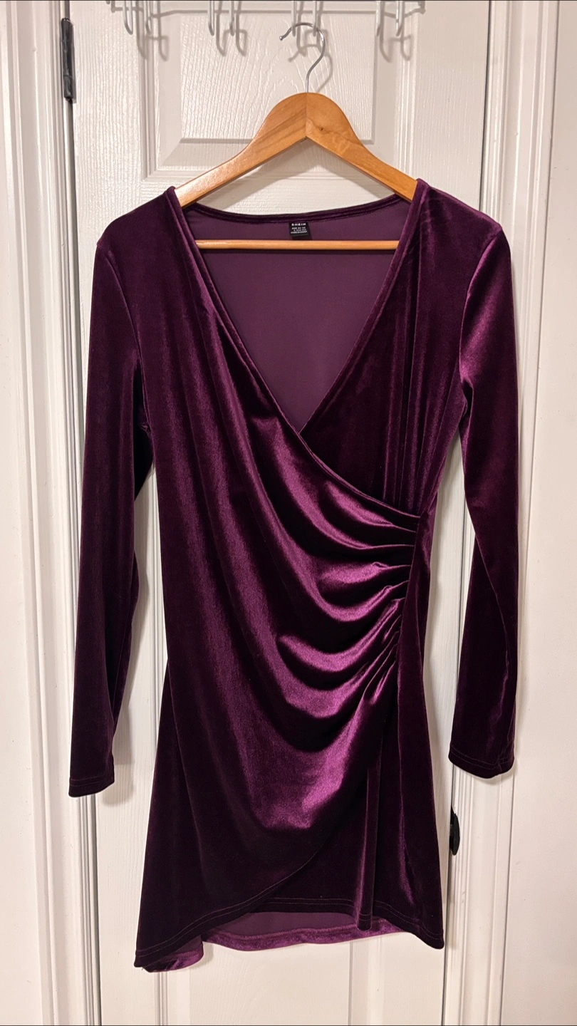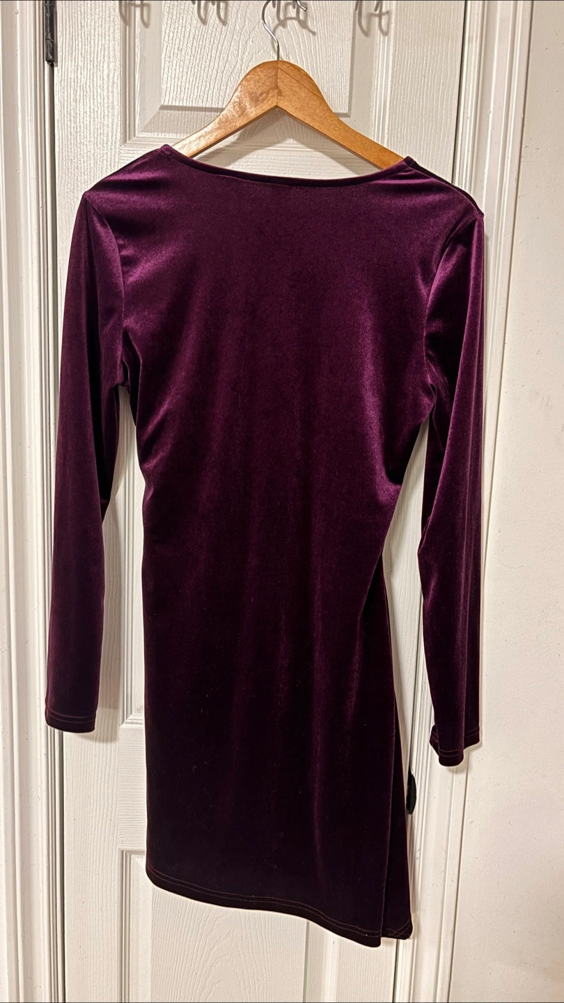 328Purple velvet mini dress with long sleeves and wrap style. It’s slightly stretchy. Worn once only.