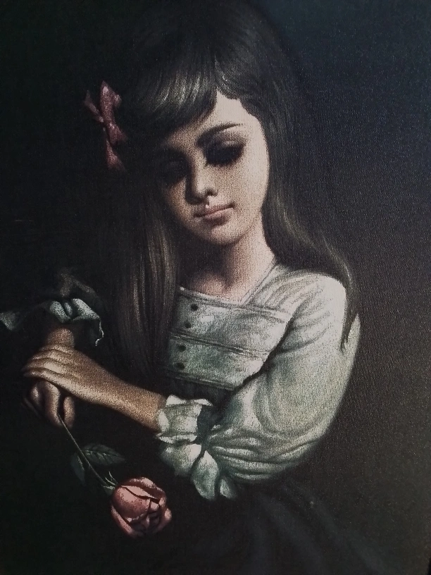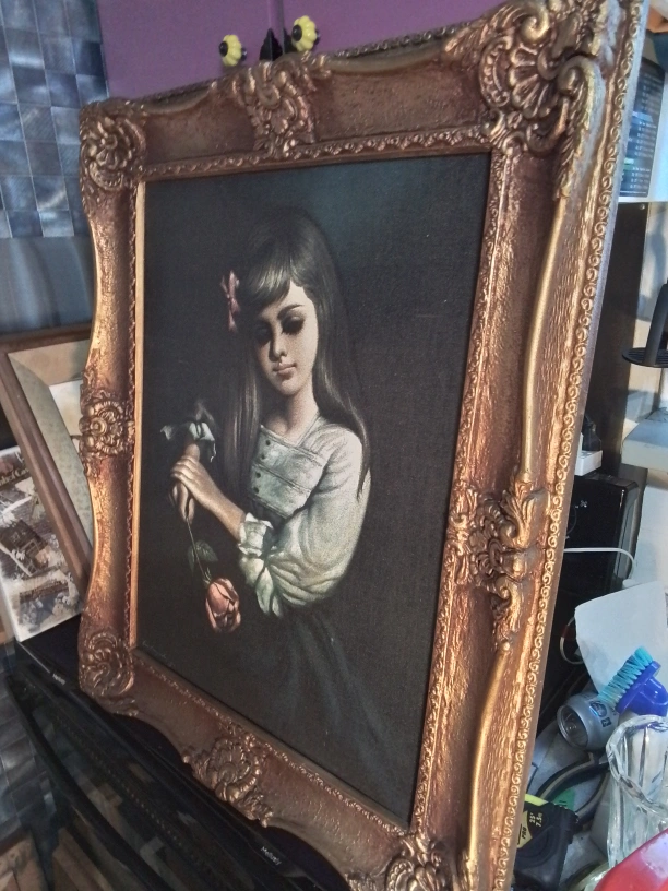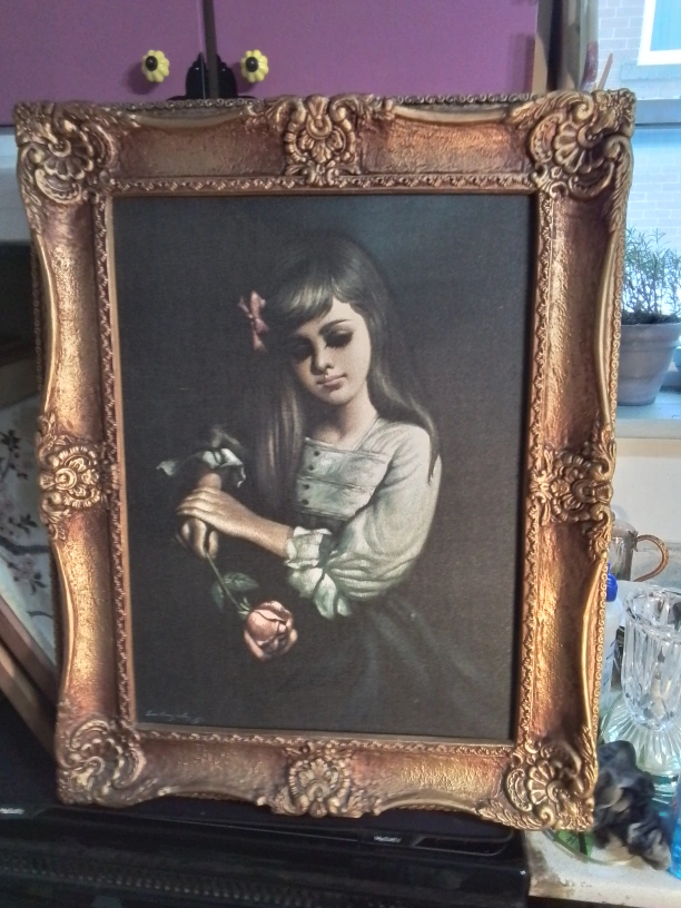 114Velvet painting with gold frame by Felix Lex Gonzalez The artists name is Felix Lex Gonzalez. He is from the Philippines. His father was Felix Pinto Gonzalez another famous Philippine painter. Lex later moved to the U.S. where he became primarily known for his still life paintings on canvas. Antique Framed Velvet Painting of Girl with Rose Ornate gold frame. Depicts a young girl holding a rose. Dark background. Velvet texture. Signed Felix Lex Gonzalez antique expensive roughly 18x24 on black velvet Condition: Good Felix Gonzalez, Jr., son of the late well-known artist, Felix P. Gonzalez, was born in Manila on October 31, 1938. Exposed to art early in his childhood, Felix, known as Lex, did pencil drawings even before he reached school age. He was in his senior year in the College of Architecture when he decided to devote full time to painting. His first attempt in joining an art competition won him third honorable mention for his painting entitled The Exile in a national art contest sponsored by the United Drug Company. That same year, he won the first honorable mention for his entry The Crucifixion in the National Press Club art contest. The turning point in his art career came in 1958, when he won the ... Displaying 750 of 1427 characters. Antique Framed Velvet Painting of Girl with Rose Ornate gold frame. Depicts a young girl holding a rose. Dark background. Velvet texture. Looks like a 70s or 80s piece. Signed by Felix Lex Gonzalez antique expensive roughly 18x24 on black velvet Condition: Good Pickup at Young Street and Steels Ave
