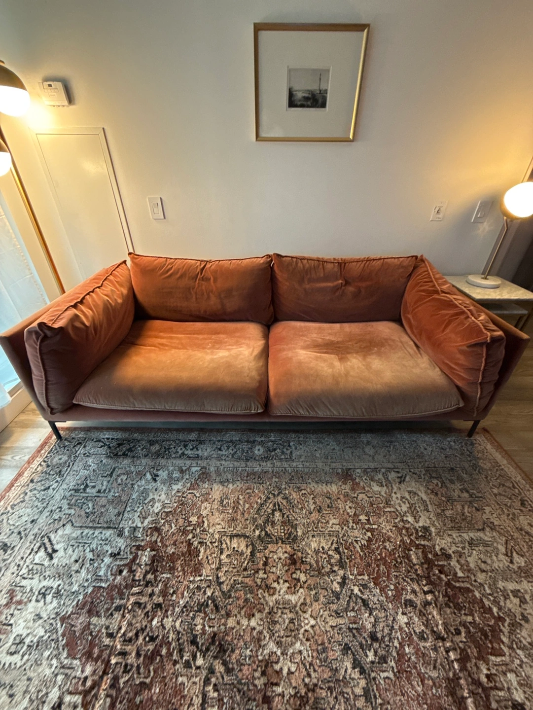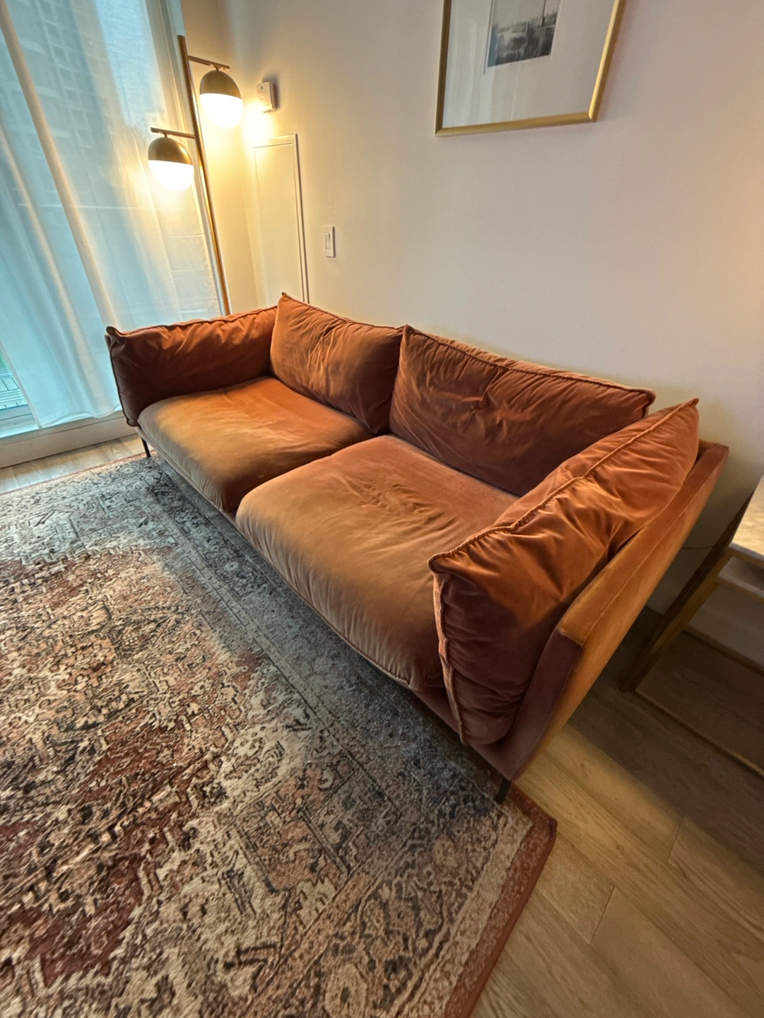 37A beautiful and comfortable velvet sofa with a modern design. It is perfect for adding a touch of elegance to any living room. It features a downfill cushion that provides excellent support and comfort. This is a great piece of furniture for anyone looking for a stylish and functional sofa.