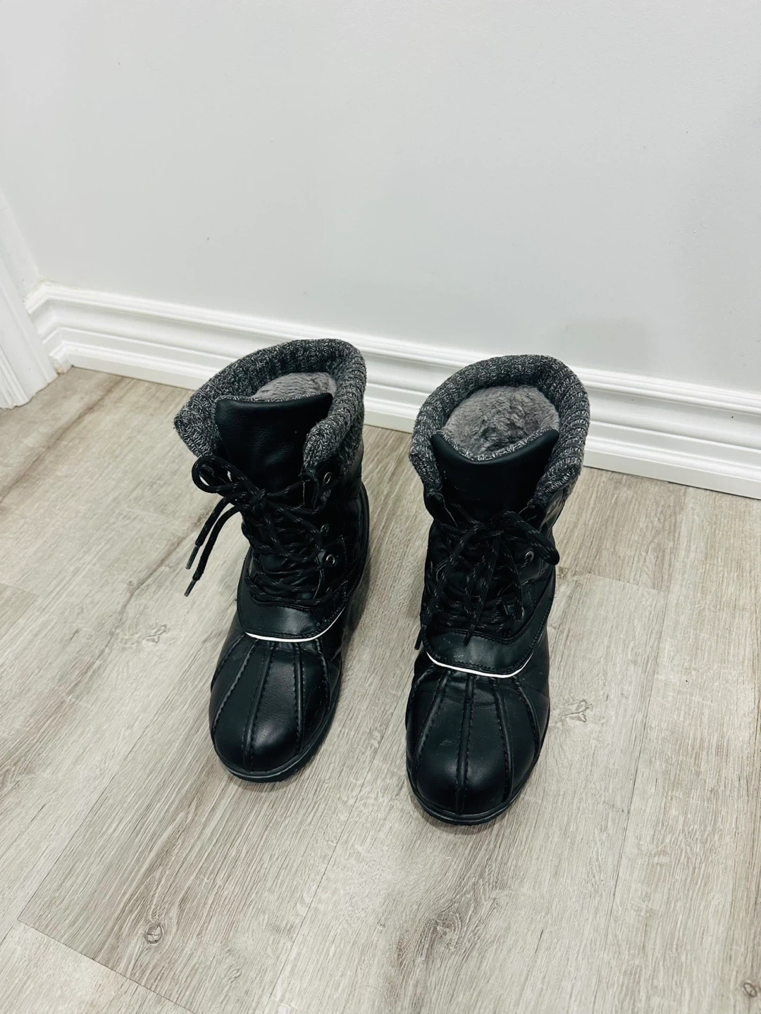 These are a pair of black winter boots. They have a quilted design and a grey knit trim. They're perfect for keeping your feet warm and dry during the winter months