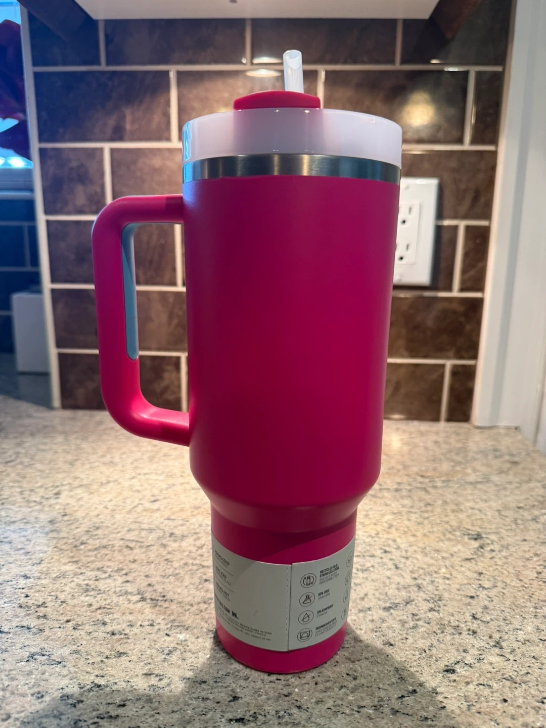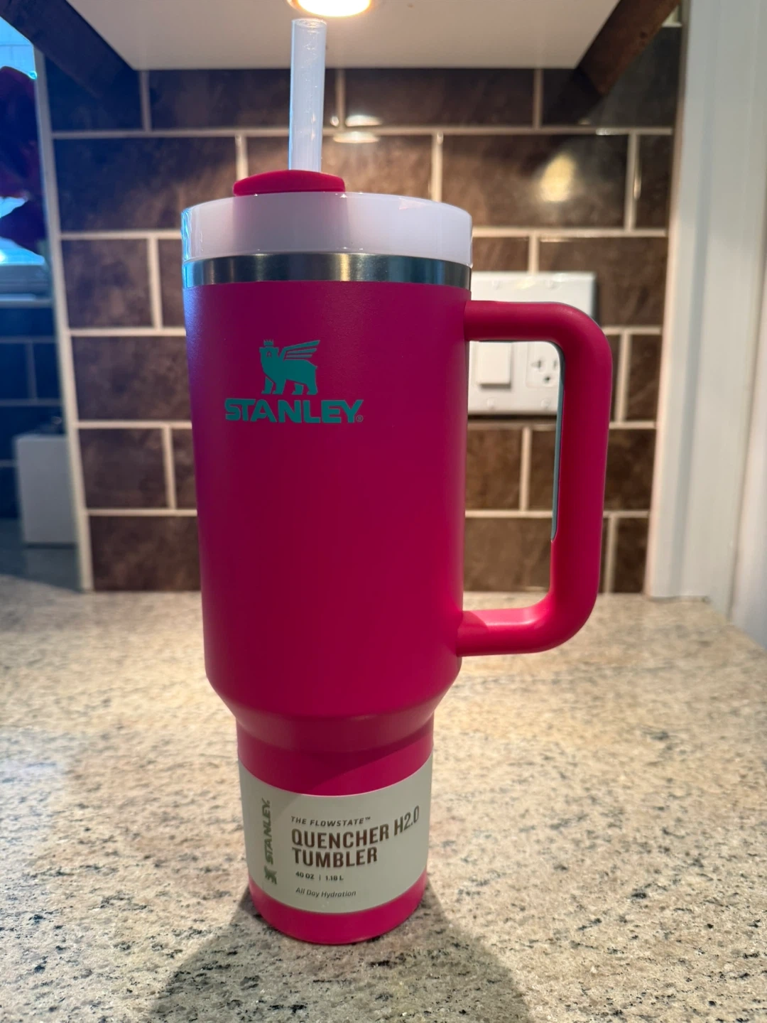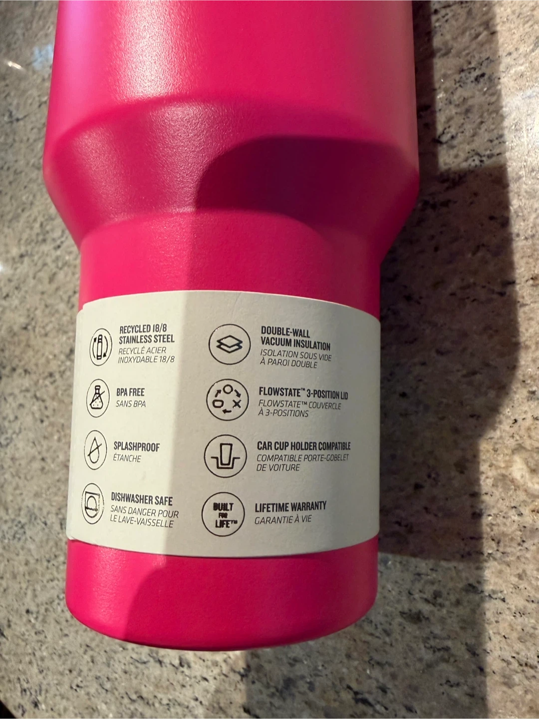 This is a brand new pink Stanley Flowstate Quencher H2.0 Tumbler. It holds 40 oz or 1.18 L and is made of stainless steel. It's BPA-free and splash-proof. This tumbler keeps drinks cold for 11 hours and hot for 7 hours.