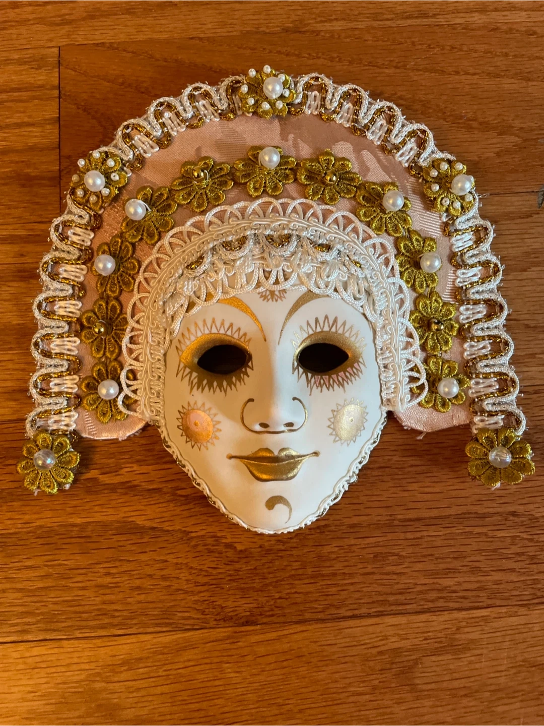 Beautiful Venetian style mask with intricate gold and pearl detailing. Perfect for adding a touch of elegance to your home decor. Bought this while traveling abroad (authentic!) It's in great condition and ready to be enjoyed!