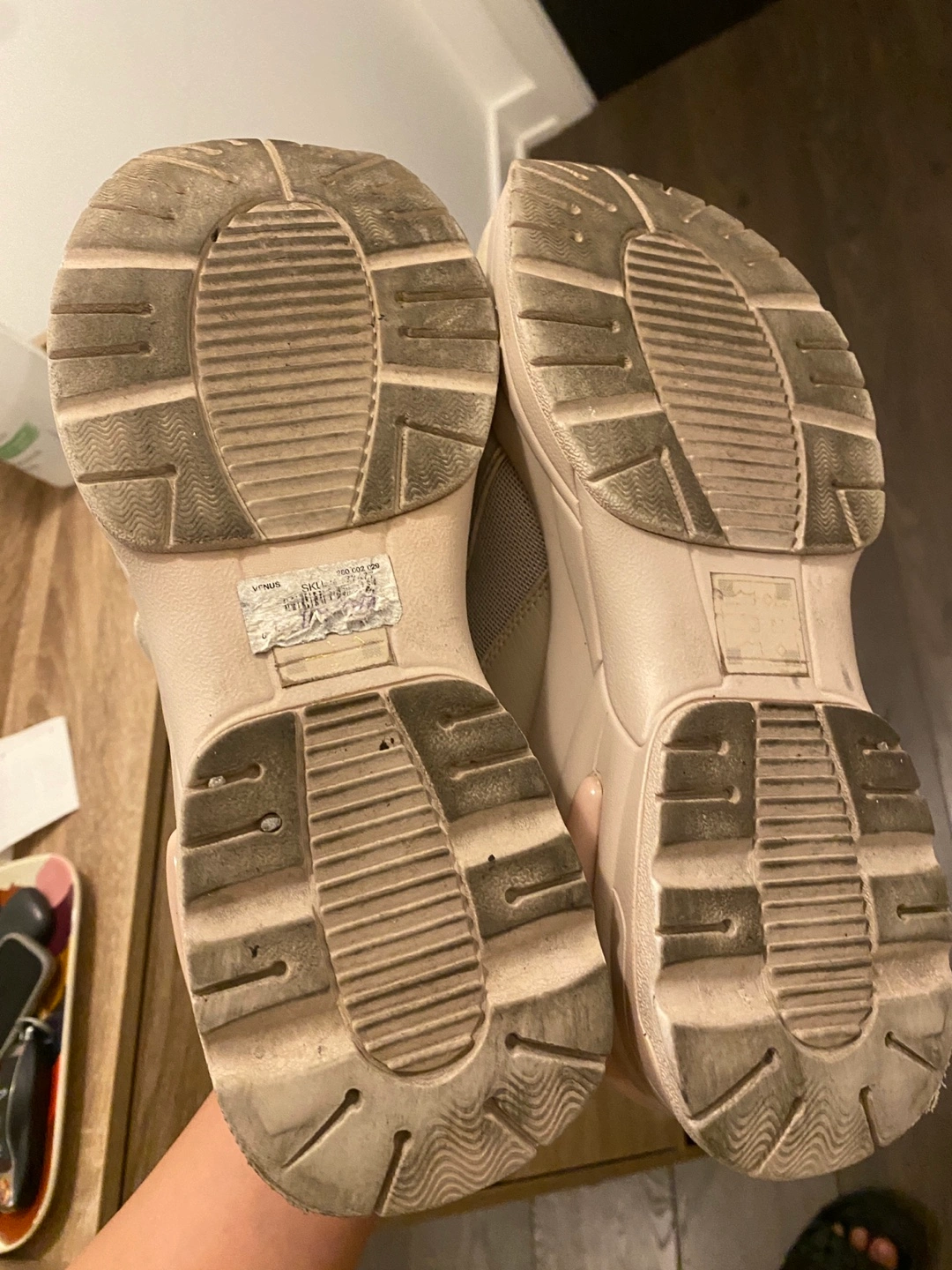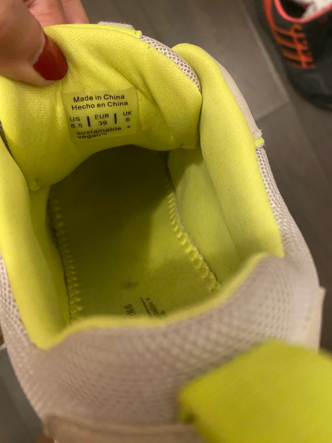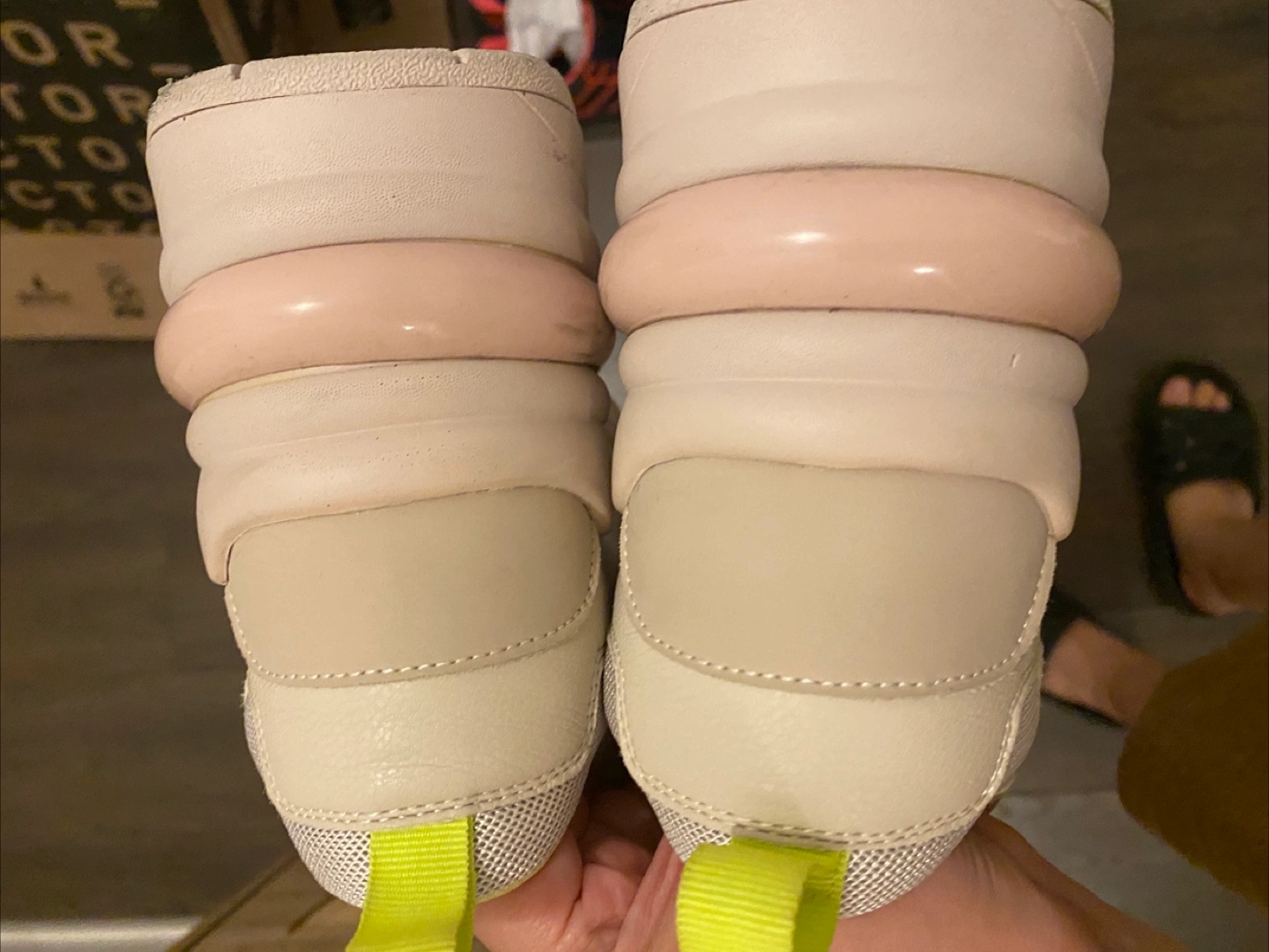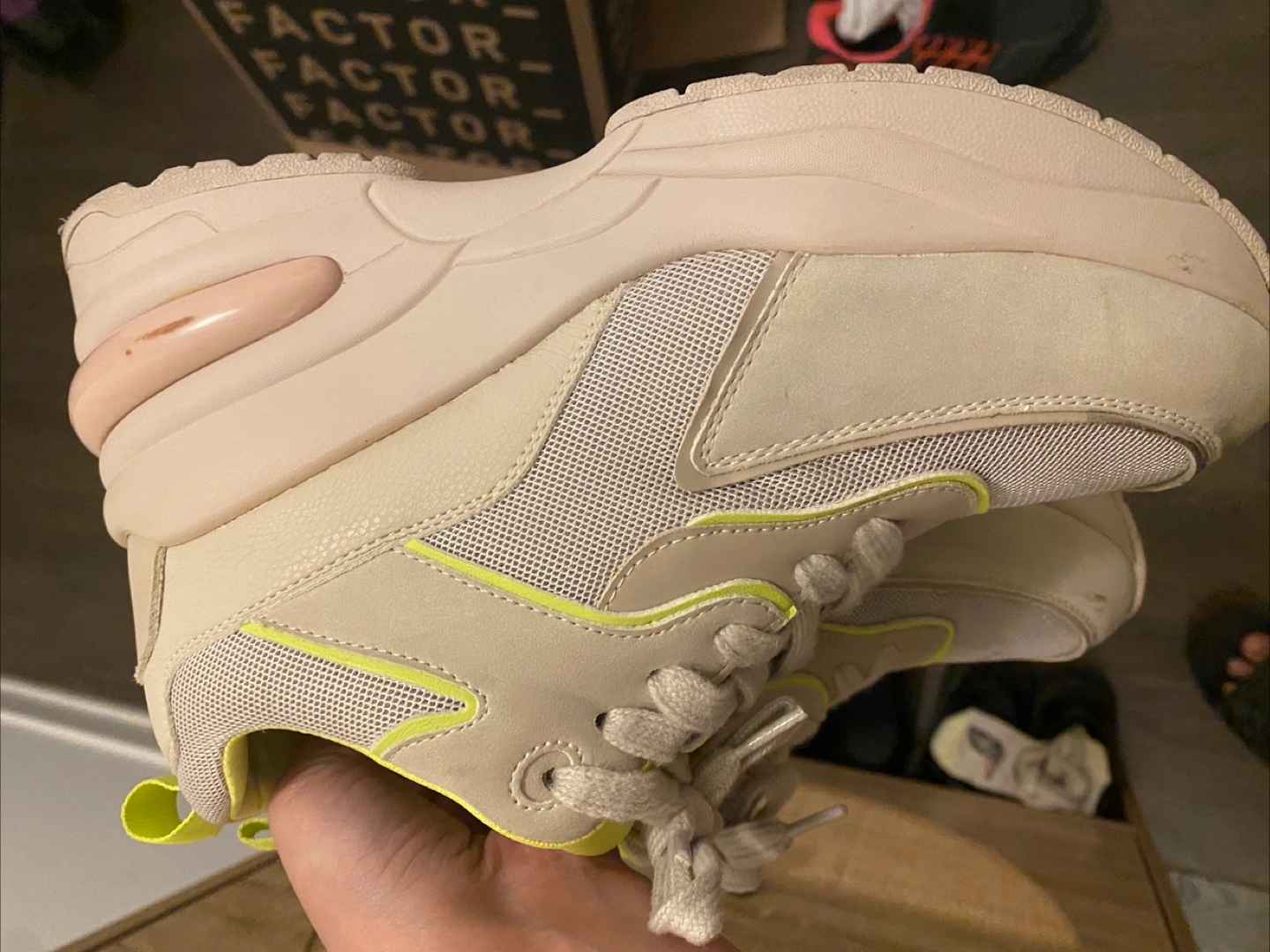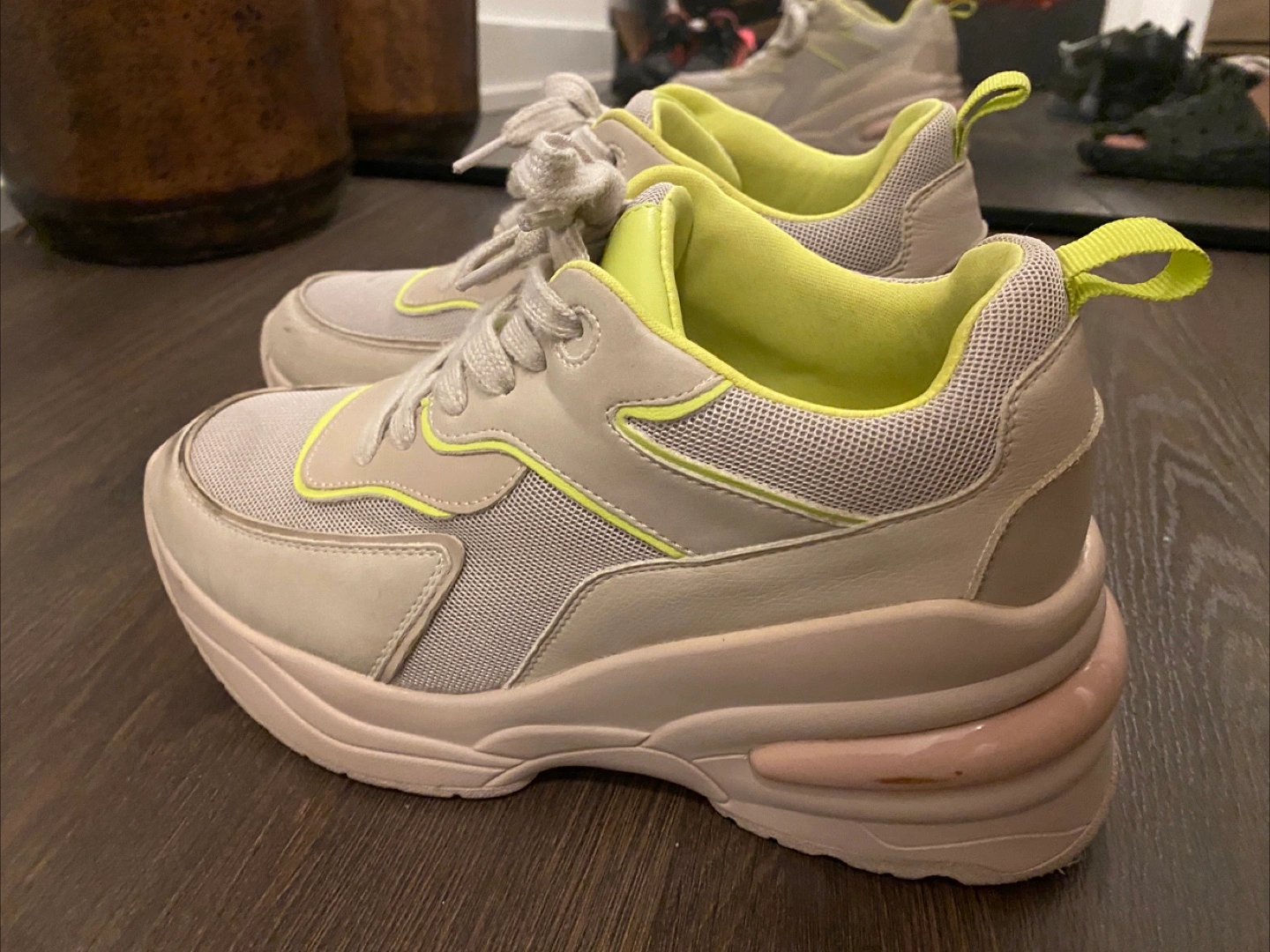 Selling a pair of Venus platform sneakers in US size 8.5. Worn thrice only; they are in good condition, as you can see from the photos. I really wanted to keep them but the fit is loose on me. They are cream and beige with neon yellow accents. Heel height: 7.62cm. They are sustainable and vegan!