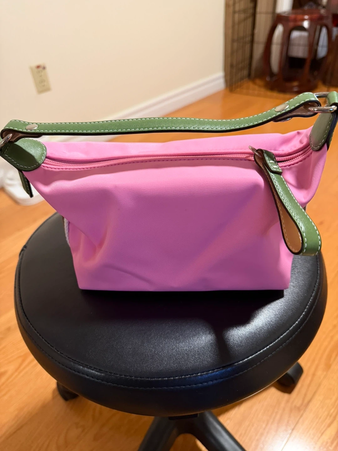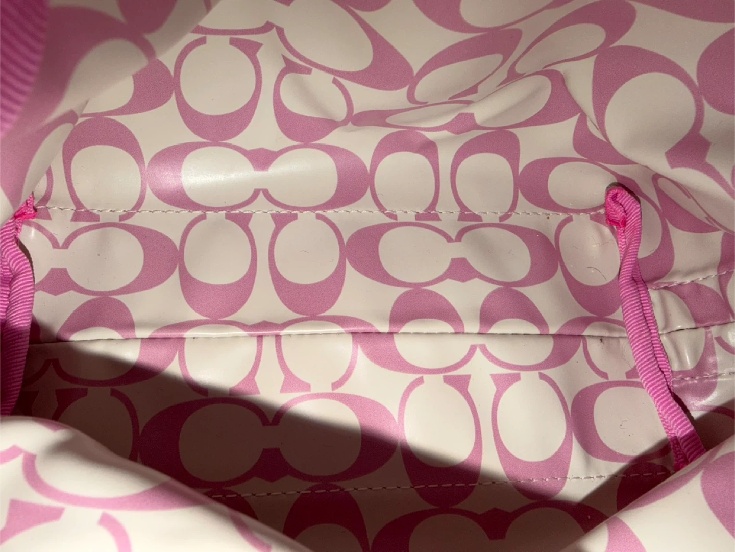 This is a Coach shoulder bag with pink nylon and green leather trim. It features the signature Coach 'C' pattern on the interior lining. Zip-top closure.