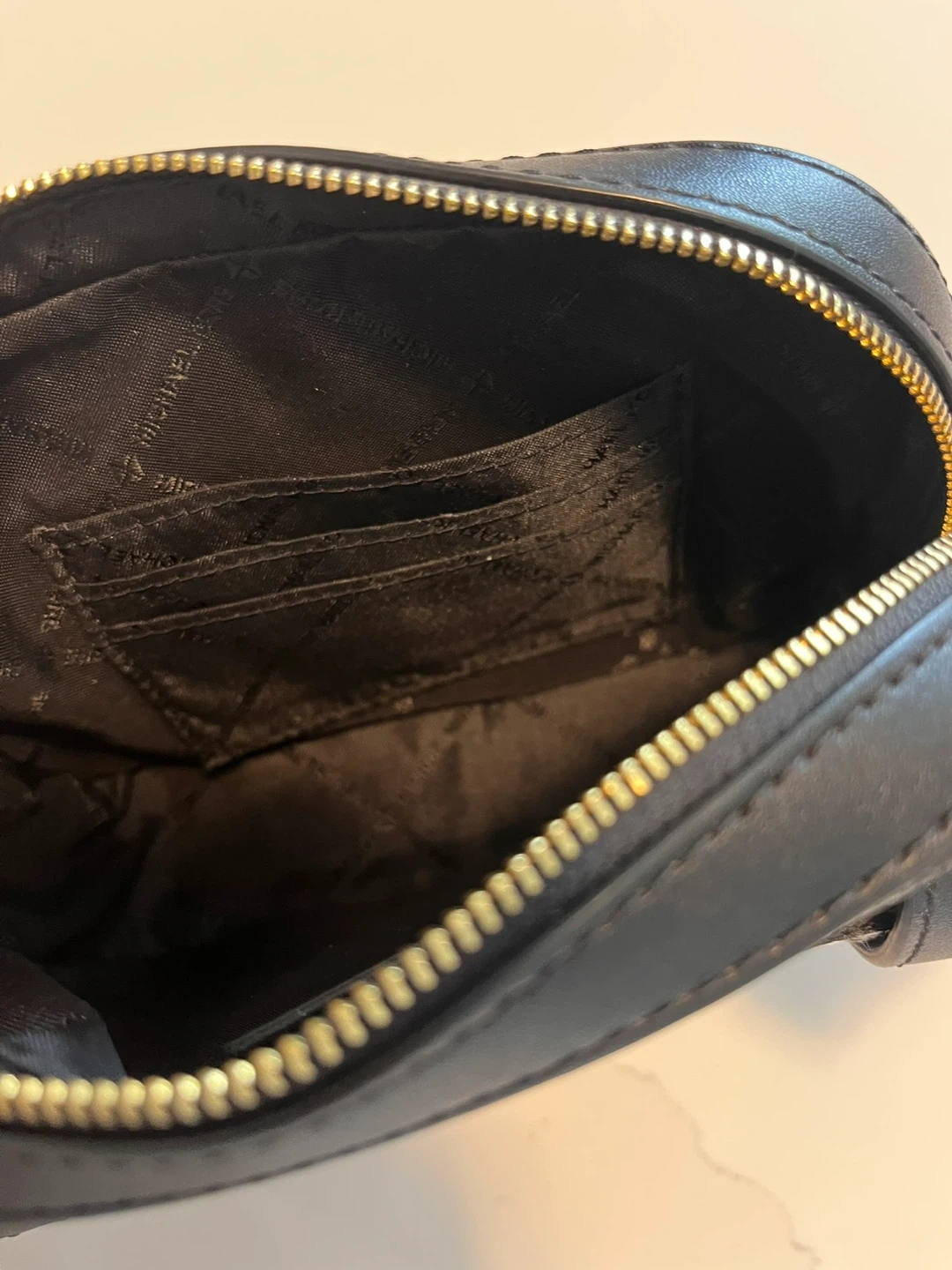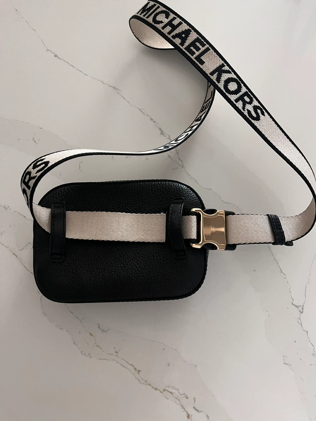 This Michael Kors belt bag is made from black pebbled leather. It features a zip-around closure and an adjustable strap with the brand's logo. The interior has card slots for organization.