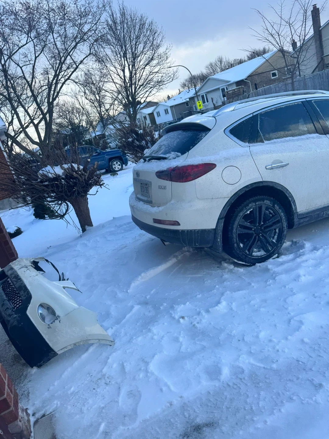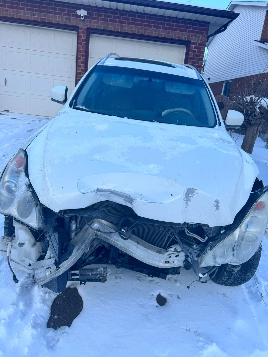 This is a white Infiniti EX35 that's been in an accident. The front end sustained significant damage, and the airbag has deployed. It's being sold as-is, suitable for parts or repair for someone with the right expertise. All major components are still attached to the frame.