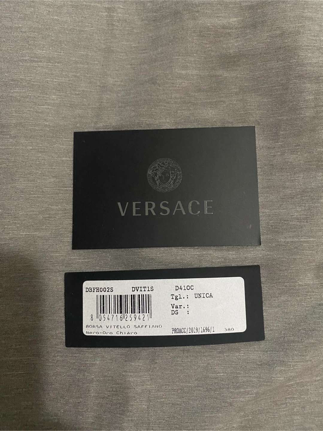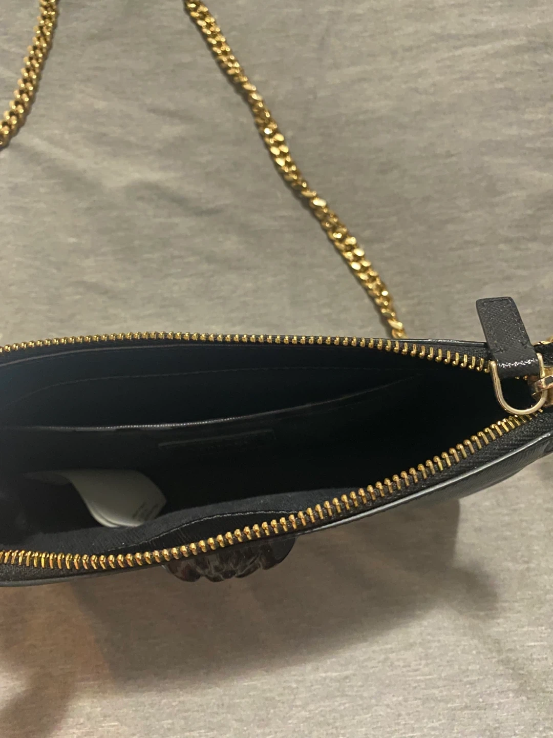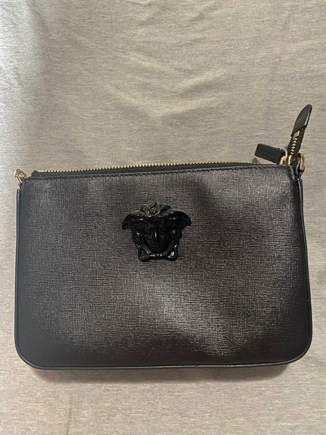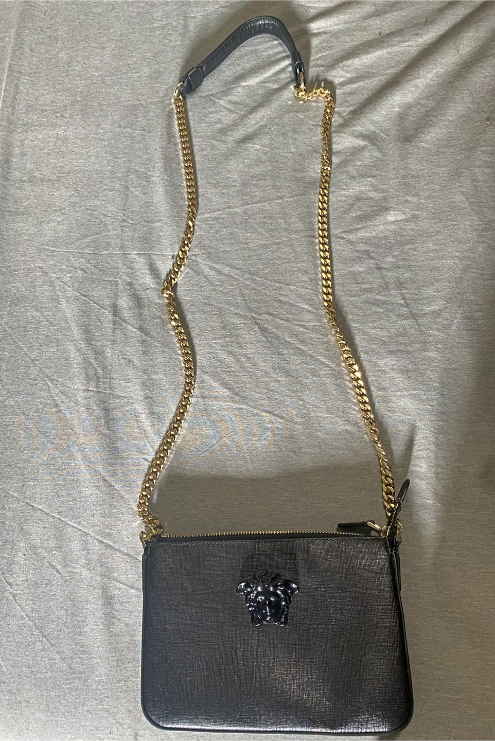 This is a stylish Versace shoulder bag in black leather with a gold chain strap. It's in great condition and perfect for adding a touch of luxury to any outfit. Serious inquiries only.