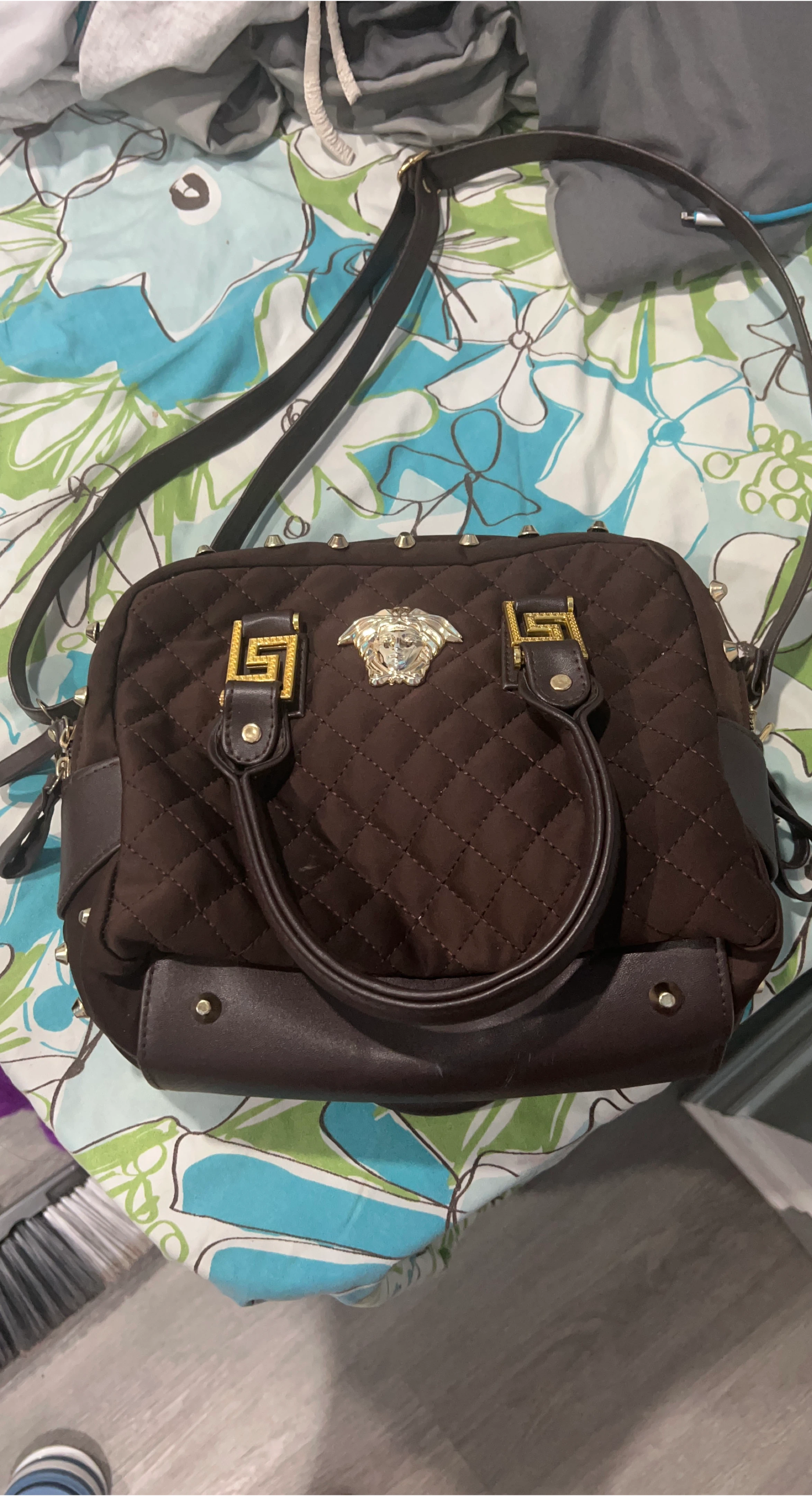 10A stylish Versace brown quilted satchel with gold accents. It features a top handle and a detachable shoulder strap for versatile carrying options. Perfect for adding a touch of luxury to your everyday look!