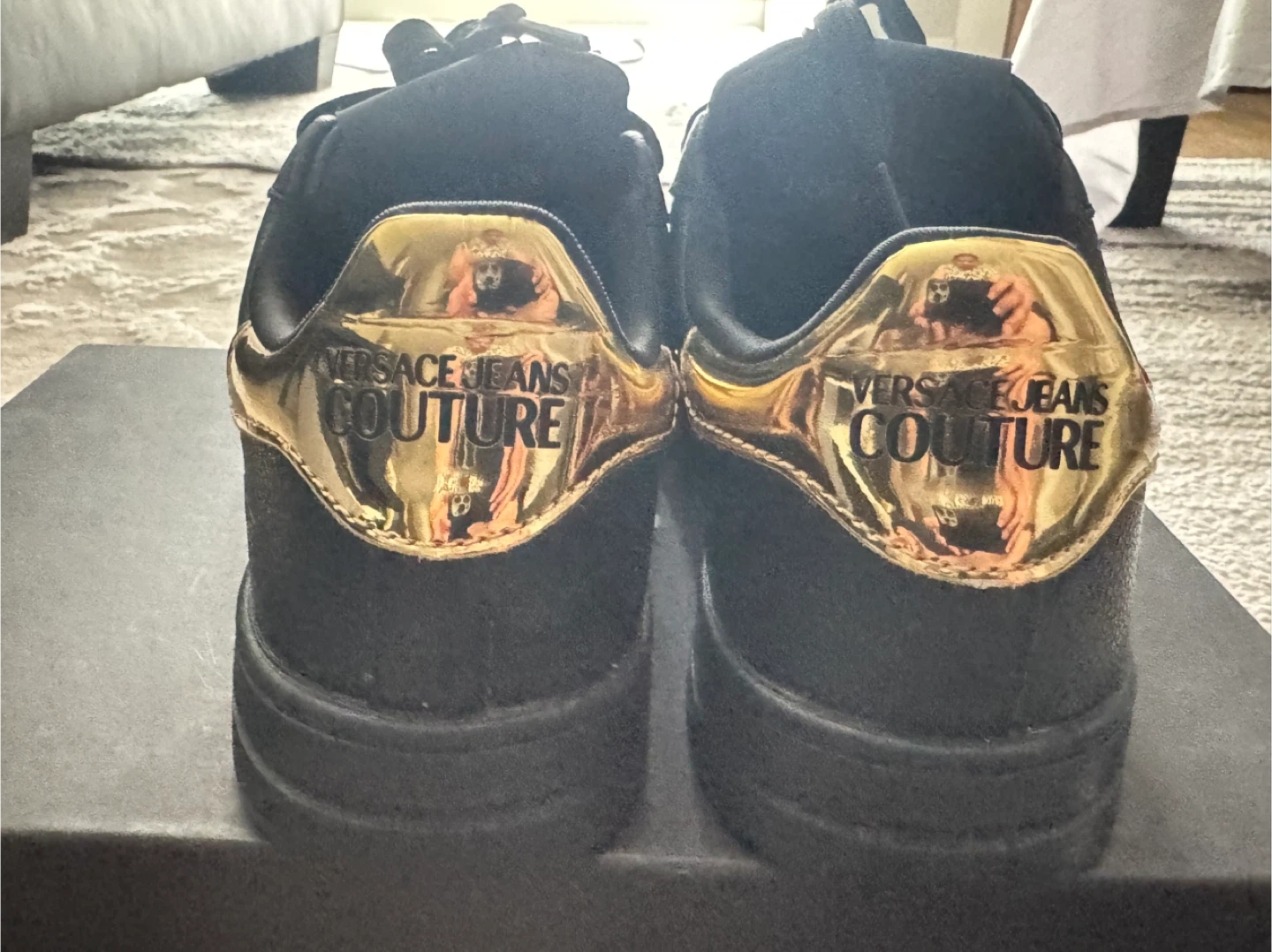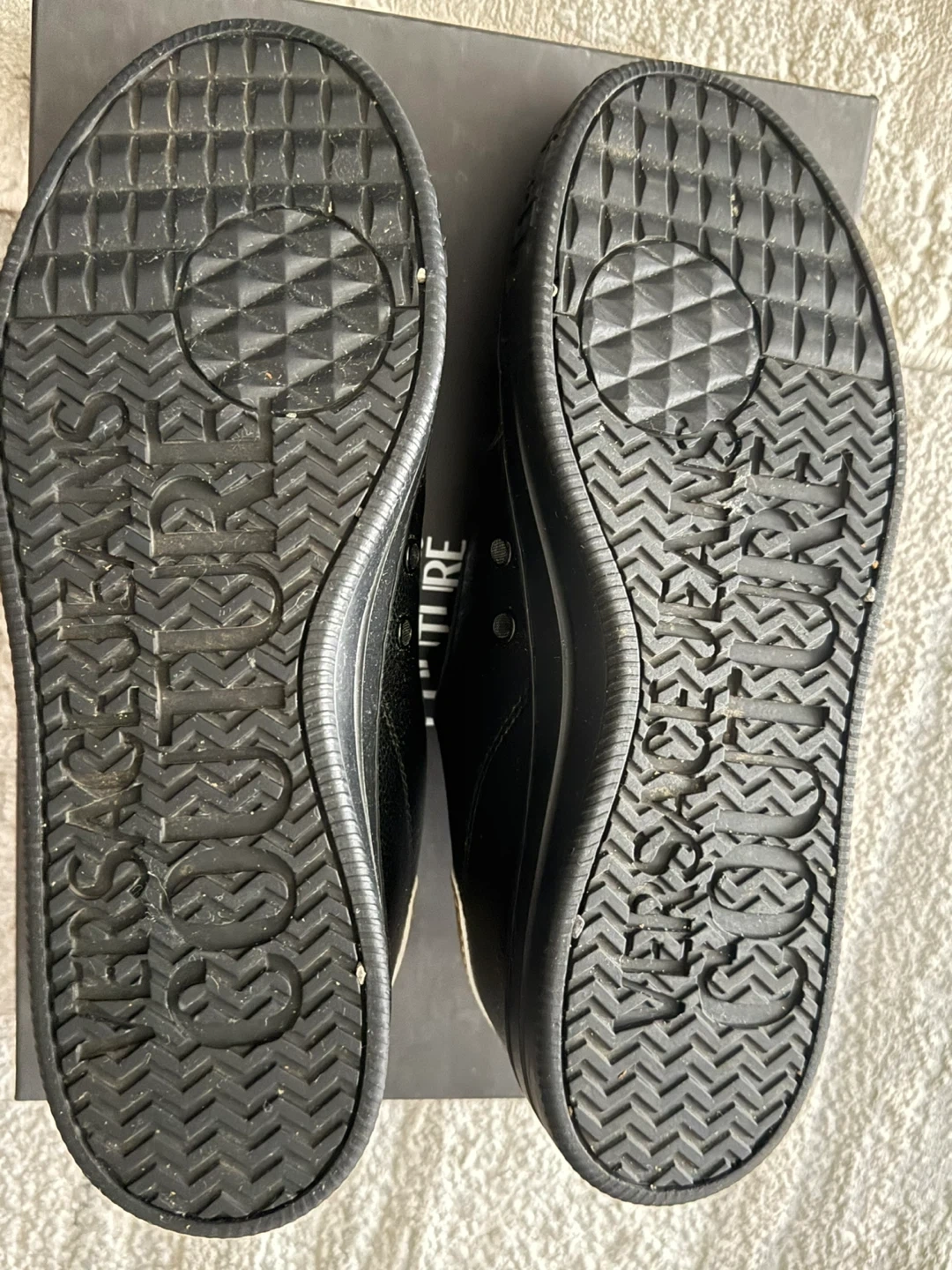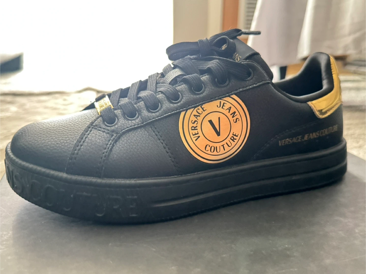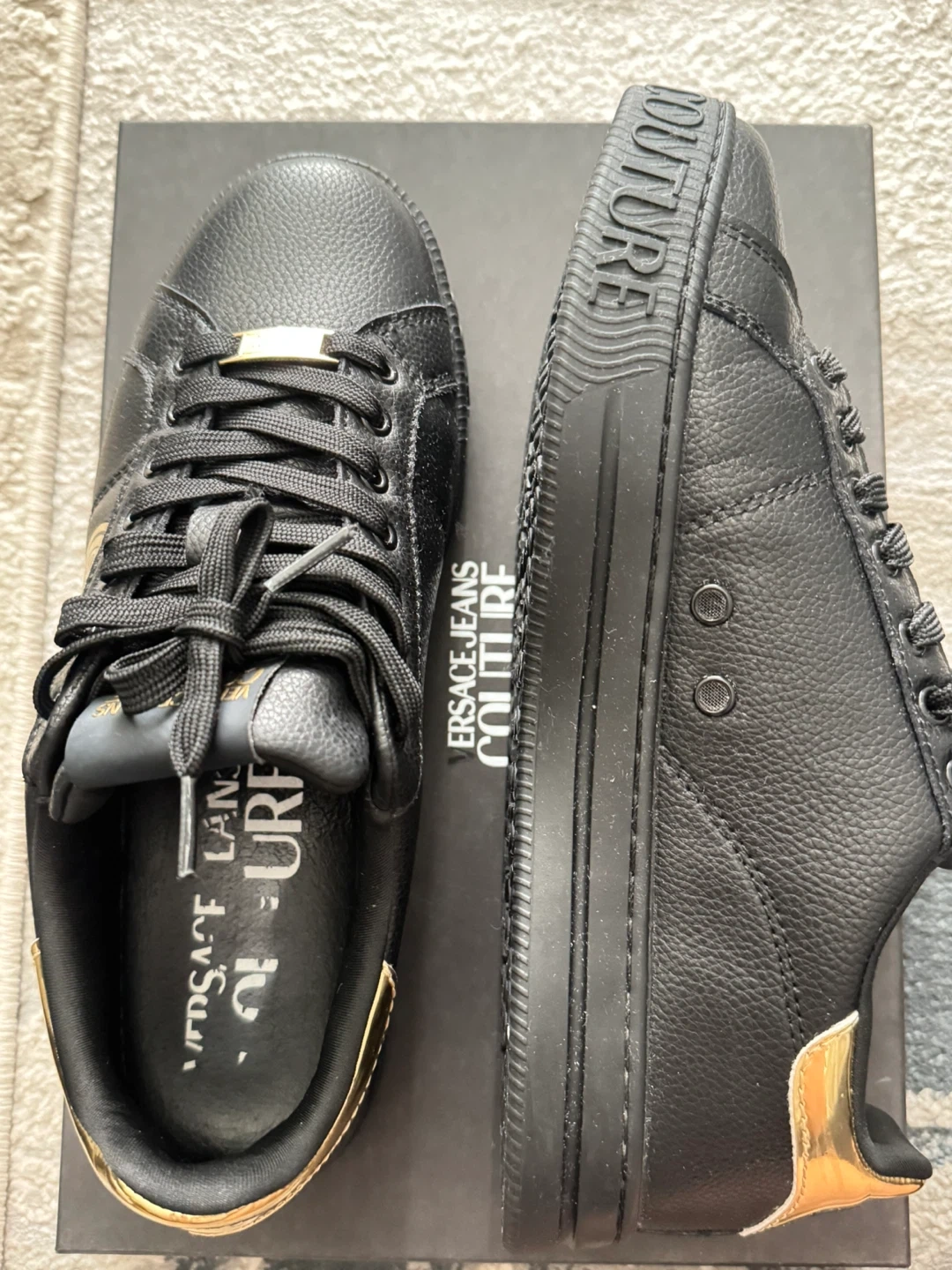 Selling a pair of Versace Jeans Couture V-Emblem Court 88 sneakers in black and gold! These stylish sneakers come with the original box and are in great condition. Originally bought for CA$400, they're a real steal