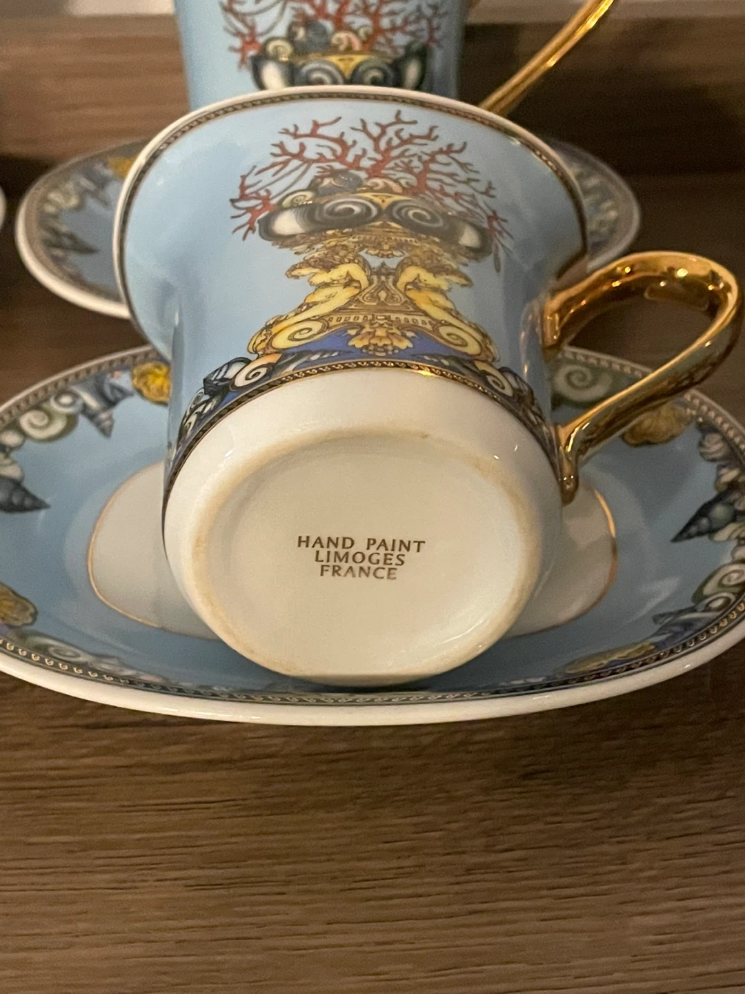 887Selling a beautiful hand painted reproduction of Versace 'Les Tresors De La Mer' tea set! The set includes a teapot, sugar bowl, creamer, and four cups with saucers. The light blue porcelain with gold accents and intricate designs will add a touch of luxury to your tea time!