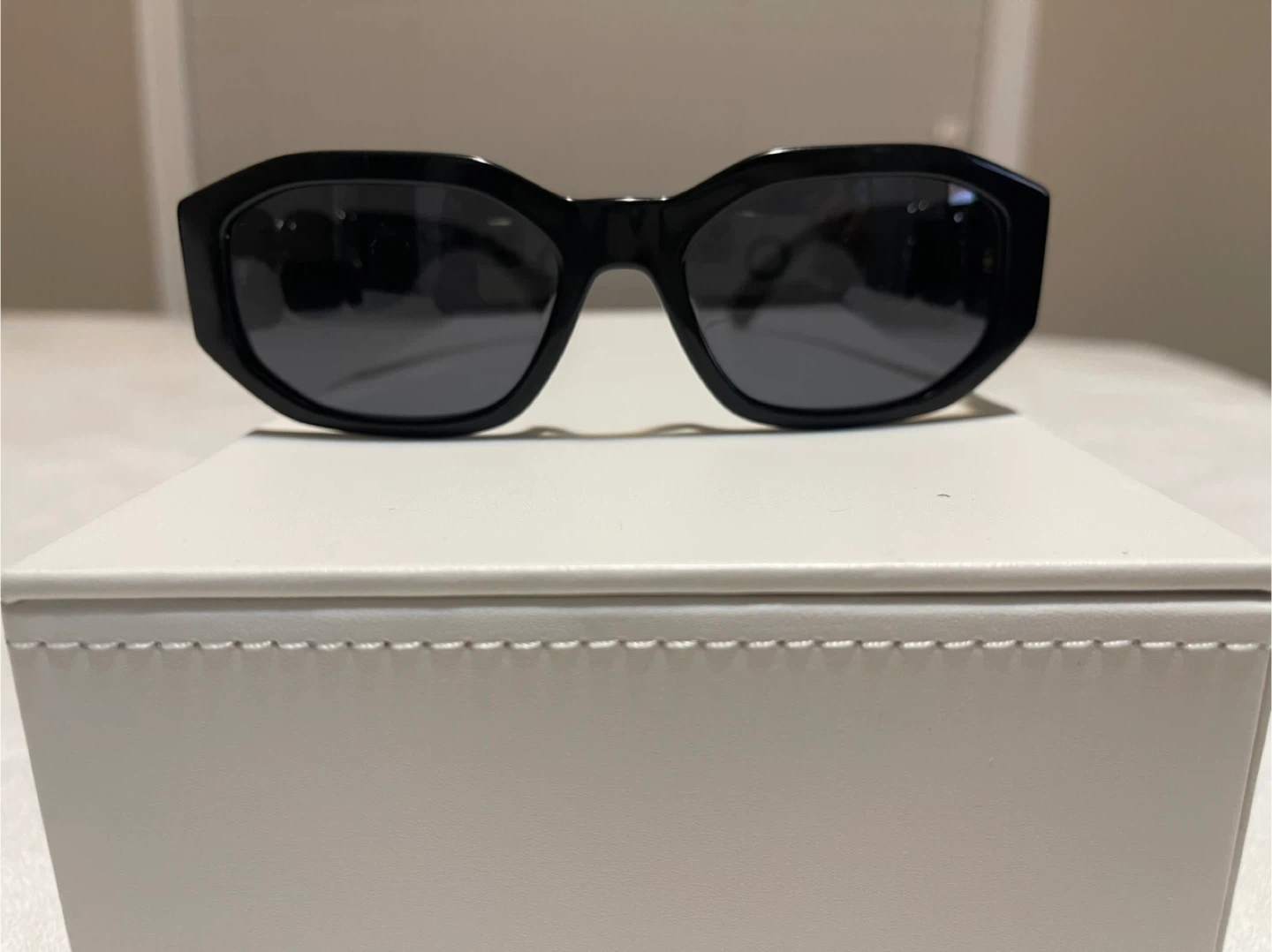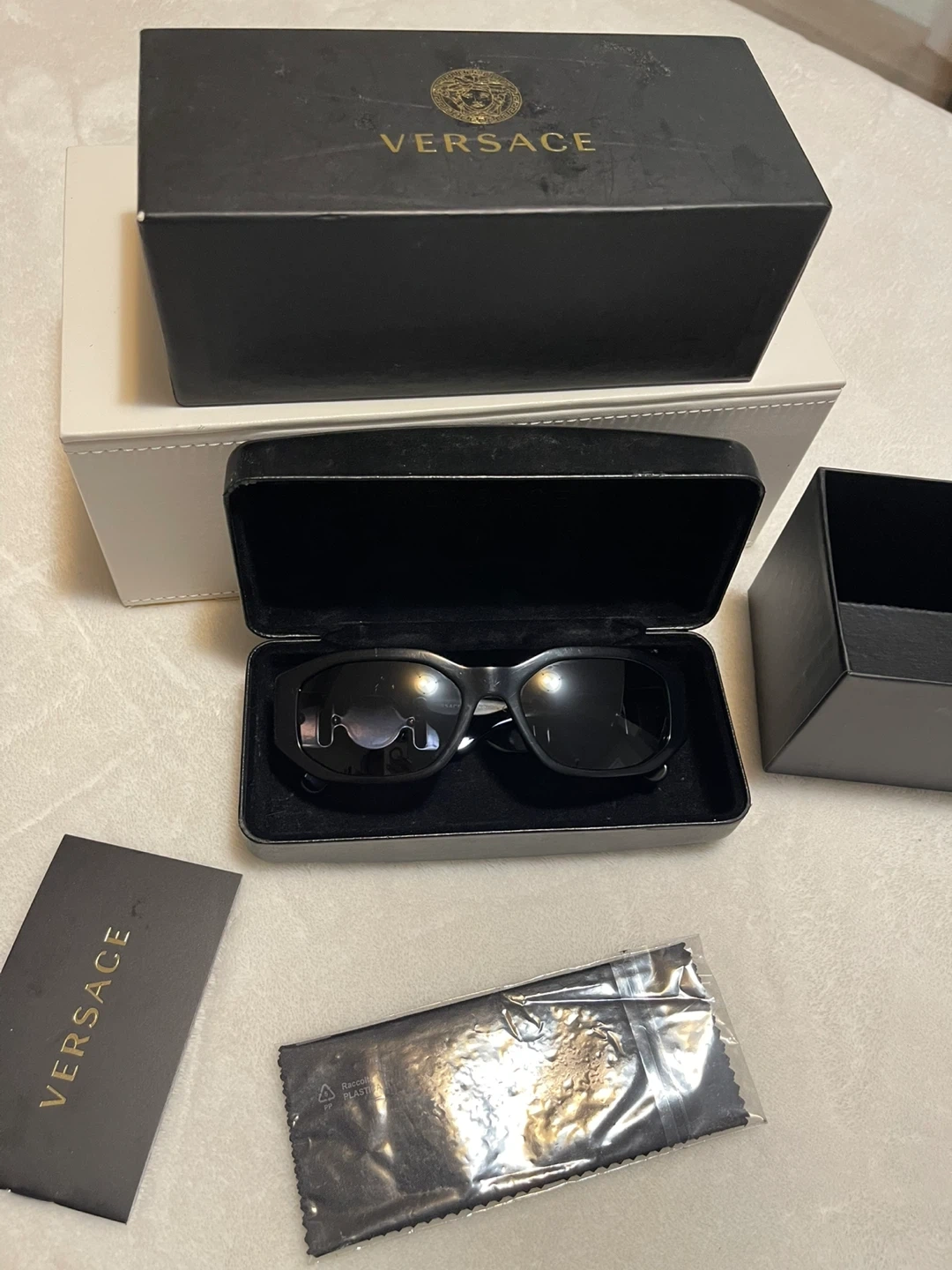 65Selling a pair of Versace sunglasses in black. They come with the original box and case for safekeeping. A stylish accessory to complete any outfit!