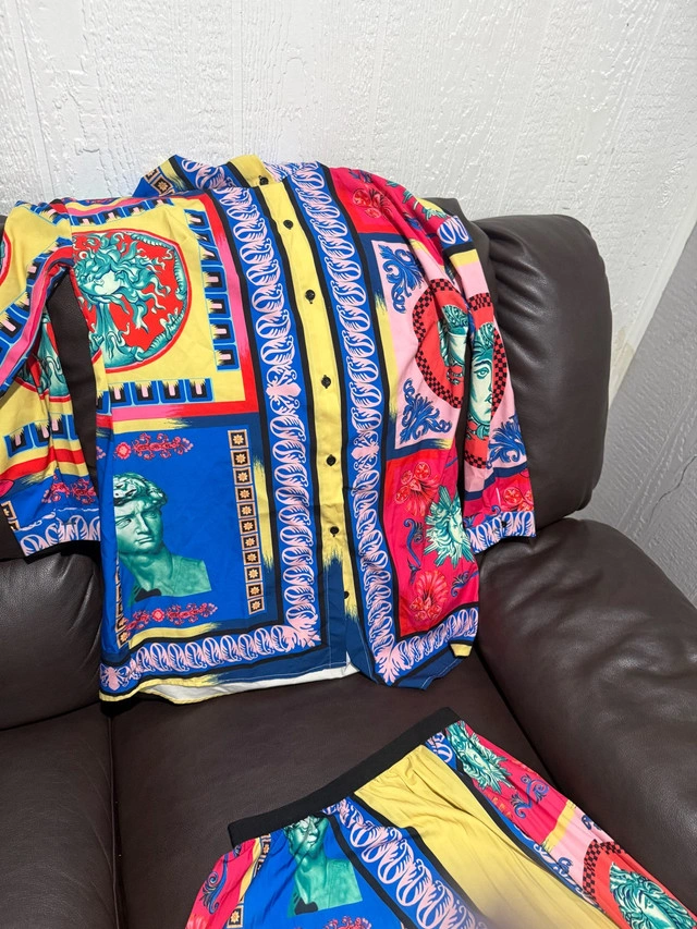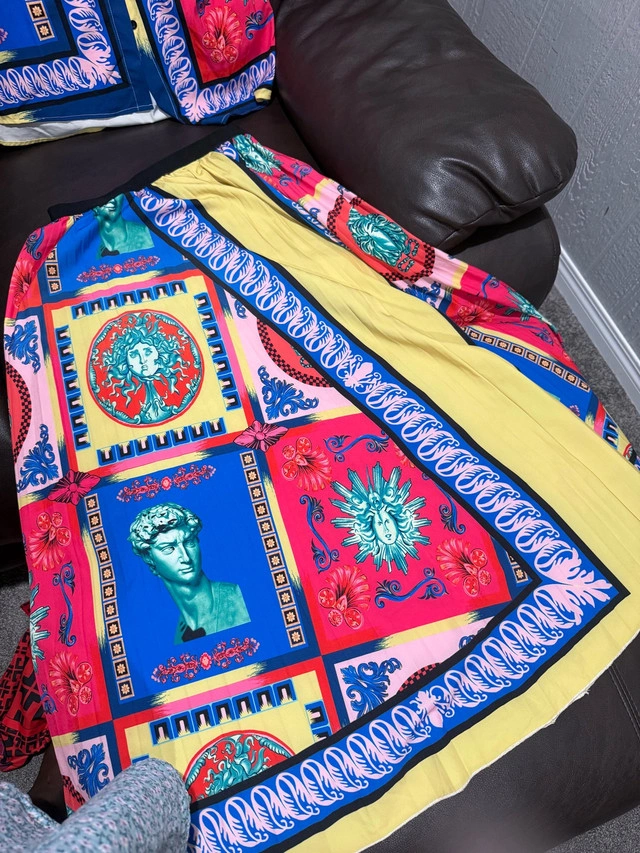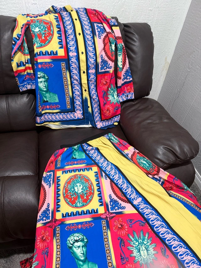 Make a bold statement with this vibrant Versace-inspired two-piece outfit! The eye-catching print features a striking combination of colours and classic Versace motifs. The condition of the set is used, but very gently so, ensuring that you get a high-fashion look without the high-end price tag. The shirt features a button-down design, while the skirt is an elastic waistband for a flexible and comfortable fit. Specifications: * Print: Versace-inspired * Set: Includes a shirt and a skirt * Waistband: Elastic Looking at similar outfits on Kijiji, a fair price point would be $40.00. Don't miss out on this unique find! If the ad's still up, it's still available!