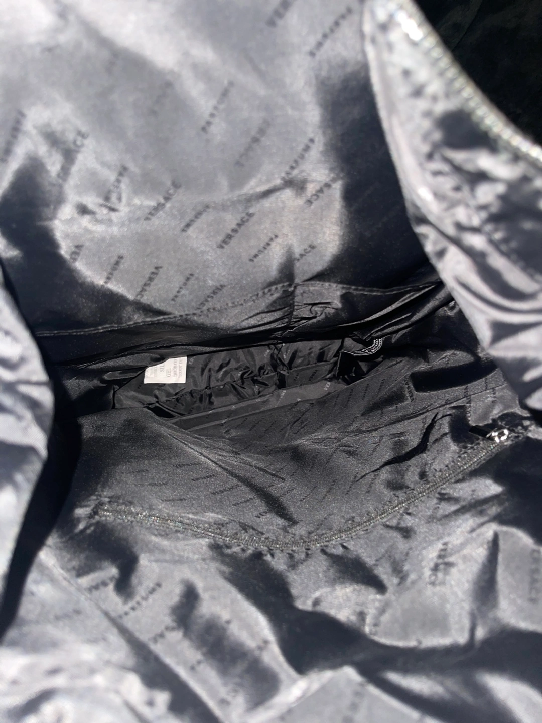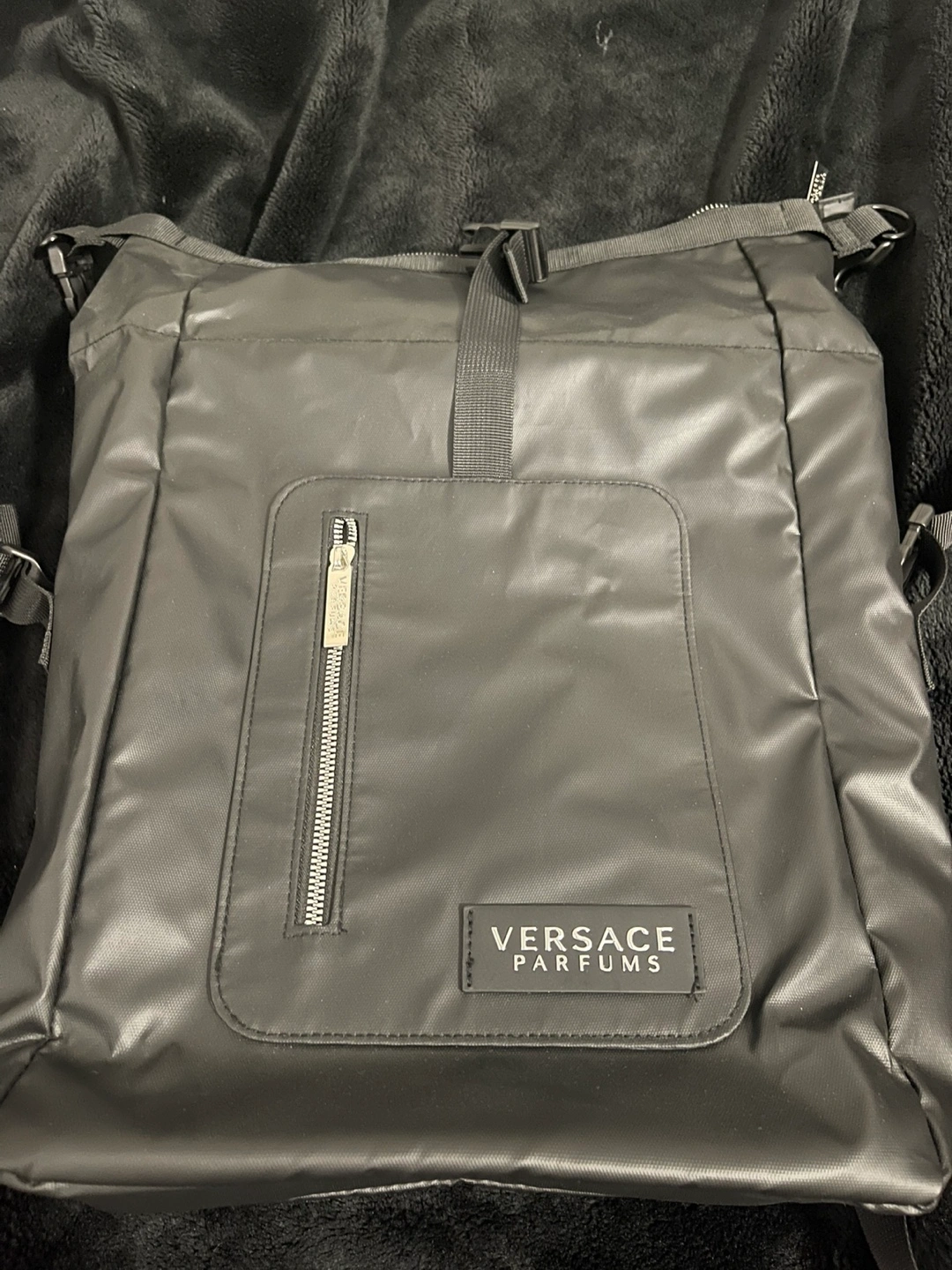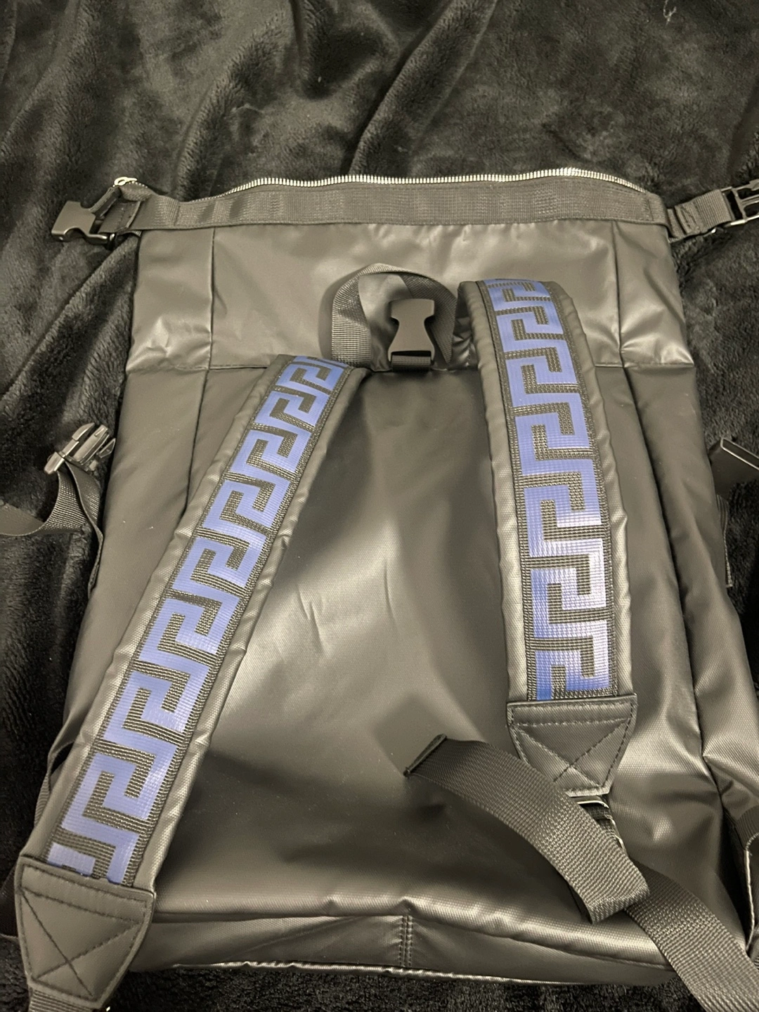 51Black backpack. Features a main compartment, zippered front pocket, and adjustable straps with a Greek key pattern. Excellent for everyday use.