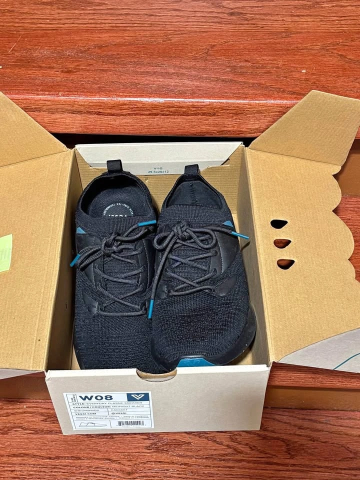 Like new condition. Only worn a few times for short periods of time. Vessi everyday classic sneaker in women’s size 8 in the colour midnight black. Waterproof shoes.