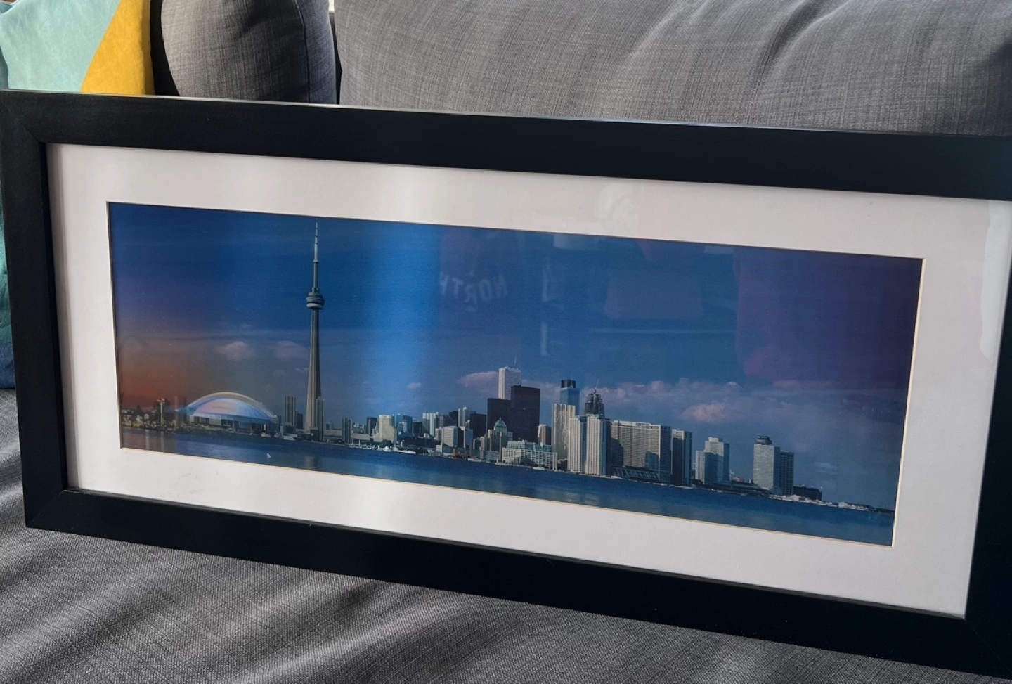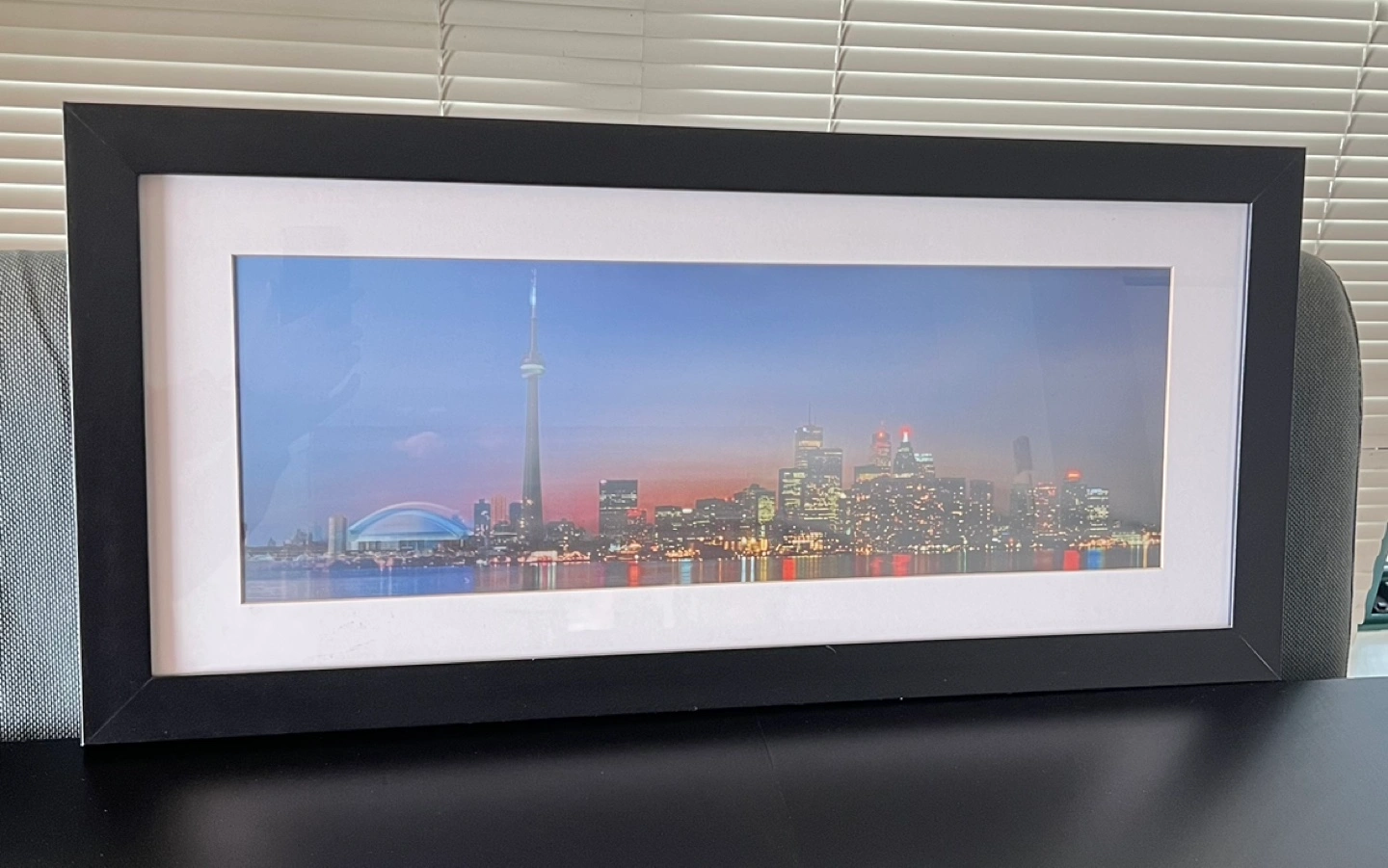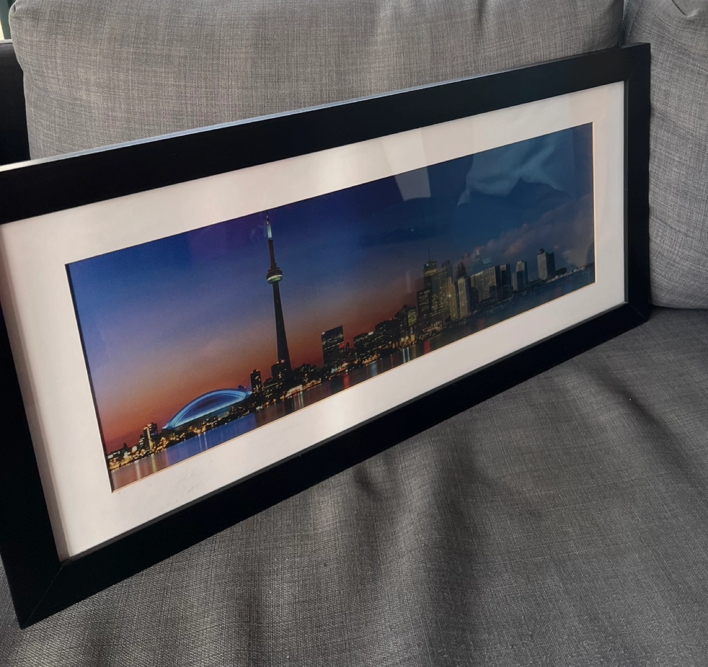 Framed lenticular wall art. Features a panoramic view of the Toronto skyline at sunset. Black frame with white matting. Excellent condition.