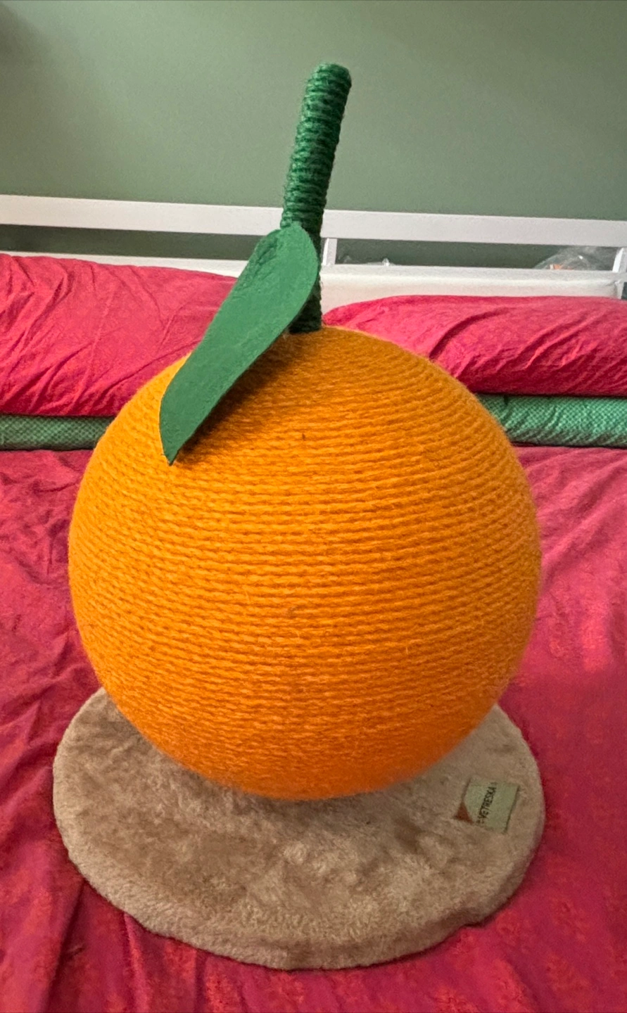 97The orange sphere is made of a fibrous material (diameter 13 inches). It sits atop a cushioned base. The base has a soft, fuzzy texture. The scratcher is great for helping your cat feel cozy and at peace.