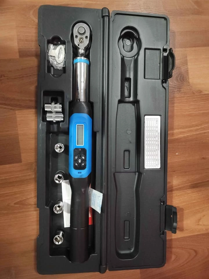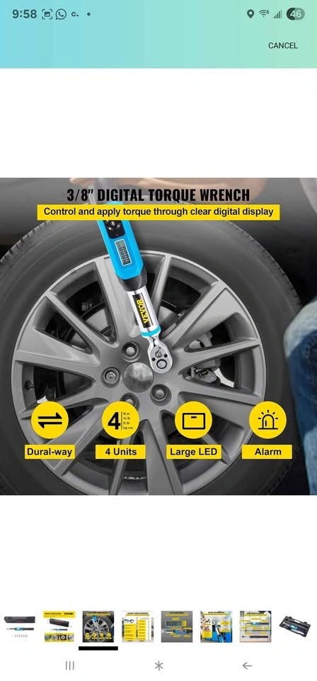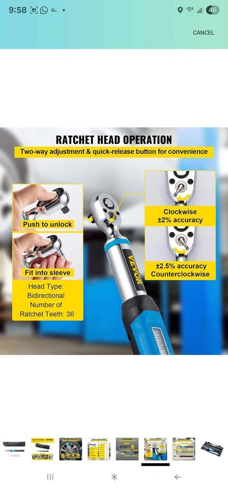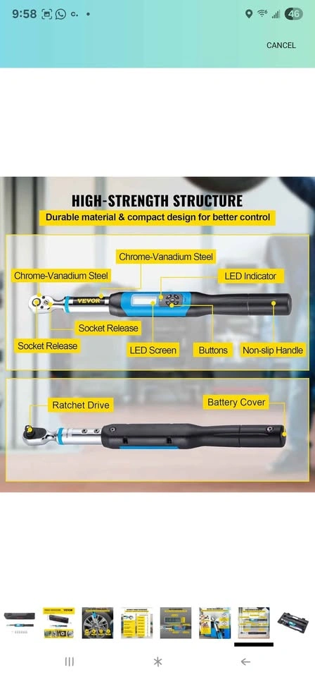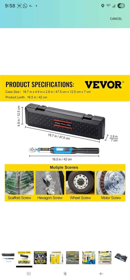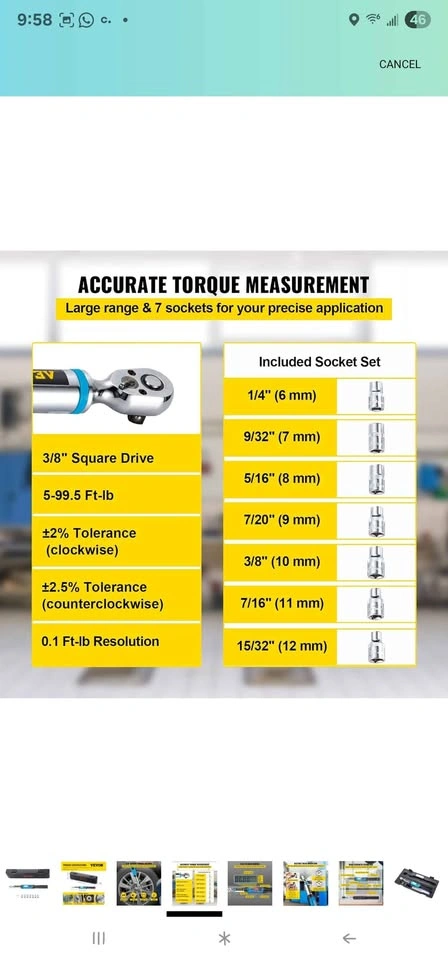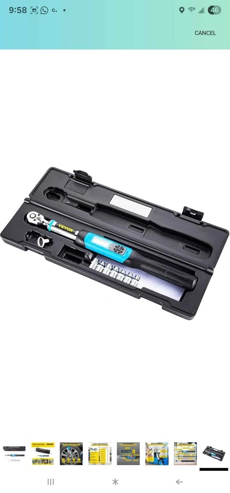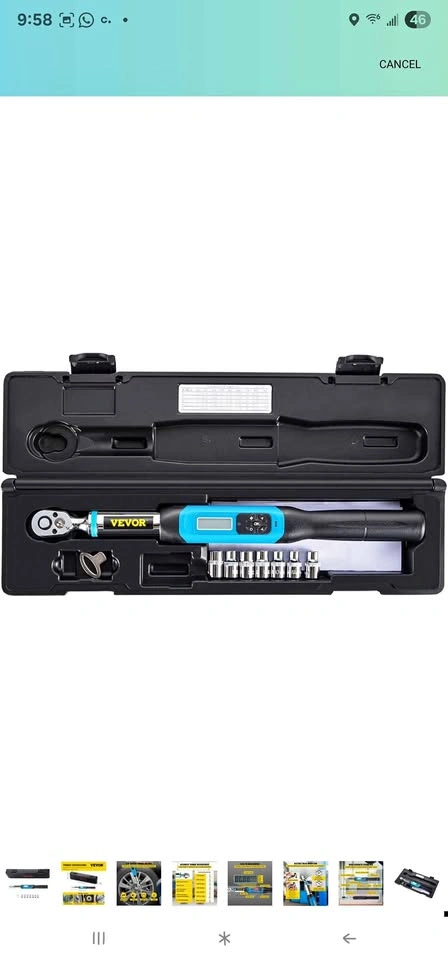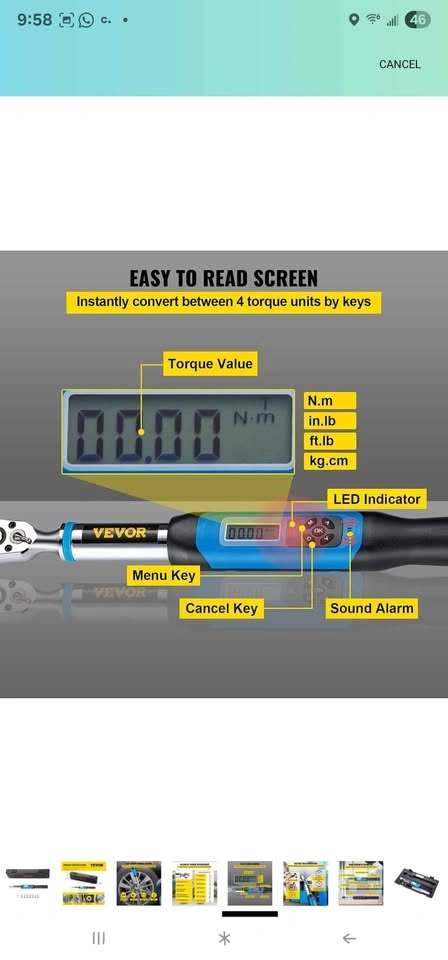 18Brand: VEVOR Material : Carbon, Plastic, Steel Item Weight: 3.4 Pounds Item Package Quantity : 1 Head Style: Flex Our digital torque wrench provides precision torque measurement from 6 to 99.5 ft-lbs, with accuracy to clockwise direction ±2% and counterclockwise direction ±2.5% in 0.1 ft-lb resolution. 7 sockets provided. It has an easy-to-read LED display providing four measurements in N-m, in-lb, ft-lb, kg-cm, and two measuring modes, i.e., real-time mode and peak mode. Set target torque and the LED & Buzzer indicator provides visual and audible feedback when value is reached. With a steering paddle, it can be used in both clockwise and counterclockwise directions. The torque wrench head has a quick-release button for easy socket changes. Constructed from premium carbon steel and industrial plastics. The head is made of hardened chrome-vanadium steel, with multi-sided bite teeth. The rubberized handle is comfortable, anti-skid, anti-rust, and corrosion-proof. It comes with a carrying case. Perfect for industrial, HVAC, automotive, and home improvement projects.