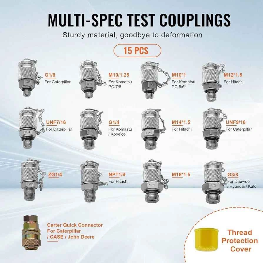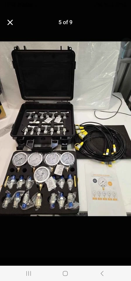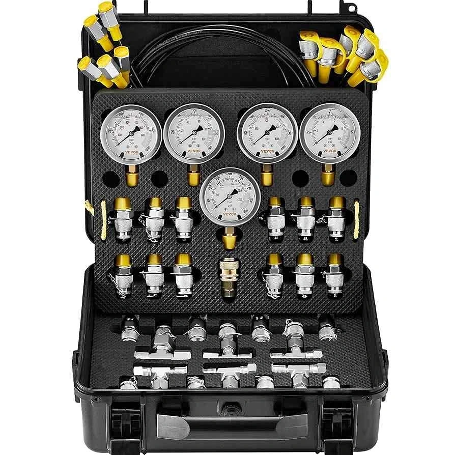 15This hydraulic test gauge kit equips you with essential tools for measuring pressure values in large hydraulic equipment systems. The 5 test gauges provide 3 pressure range options: 0-10 Bar/150 PSI, 0-100 Bar/1500 PSI, 0-250 Bar/4000 PSI, 0-400 Bar/6000 PSI, and 0-600 Bar/10000 PSI, catering to a wide range of hydraulic equipment with varying pressure values and interfaces.