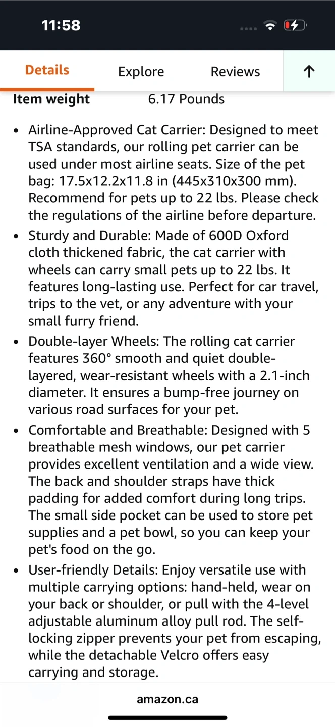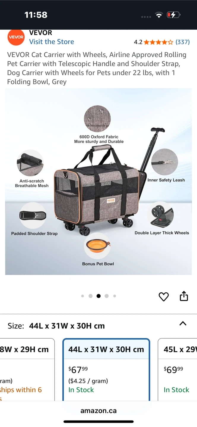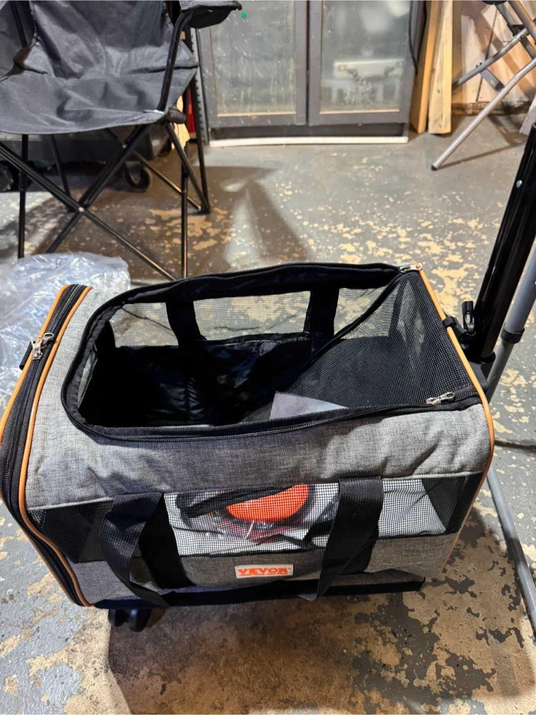 Brand new VEVOR rolling pet carrier in grey! It's airline-approved and designed to meet TSA standards, so it's perfect for travel. - Sturdy and durable with 600D Oxford cloth - Double-layer wheels for smooth rolling - Breathable mesh windows for ventilation - Includes a folding bowl Dimensions are 44L x 31W x 30H cm, suitable for pets up to 22 lbs. pick up in Baxter