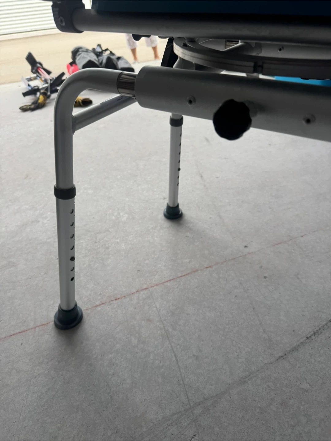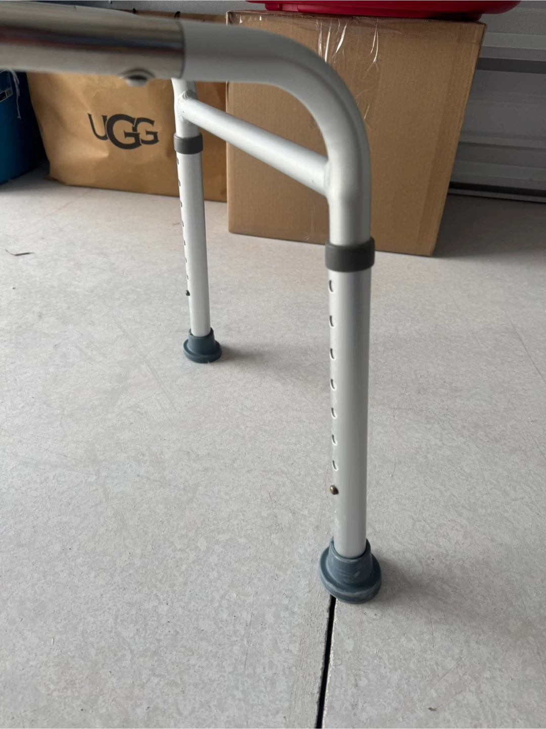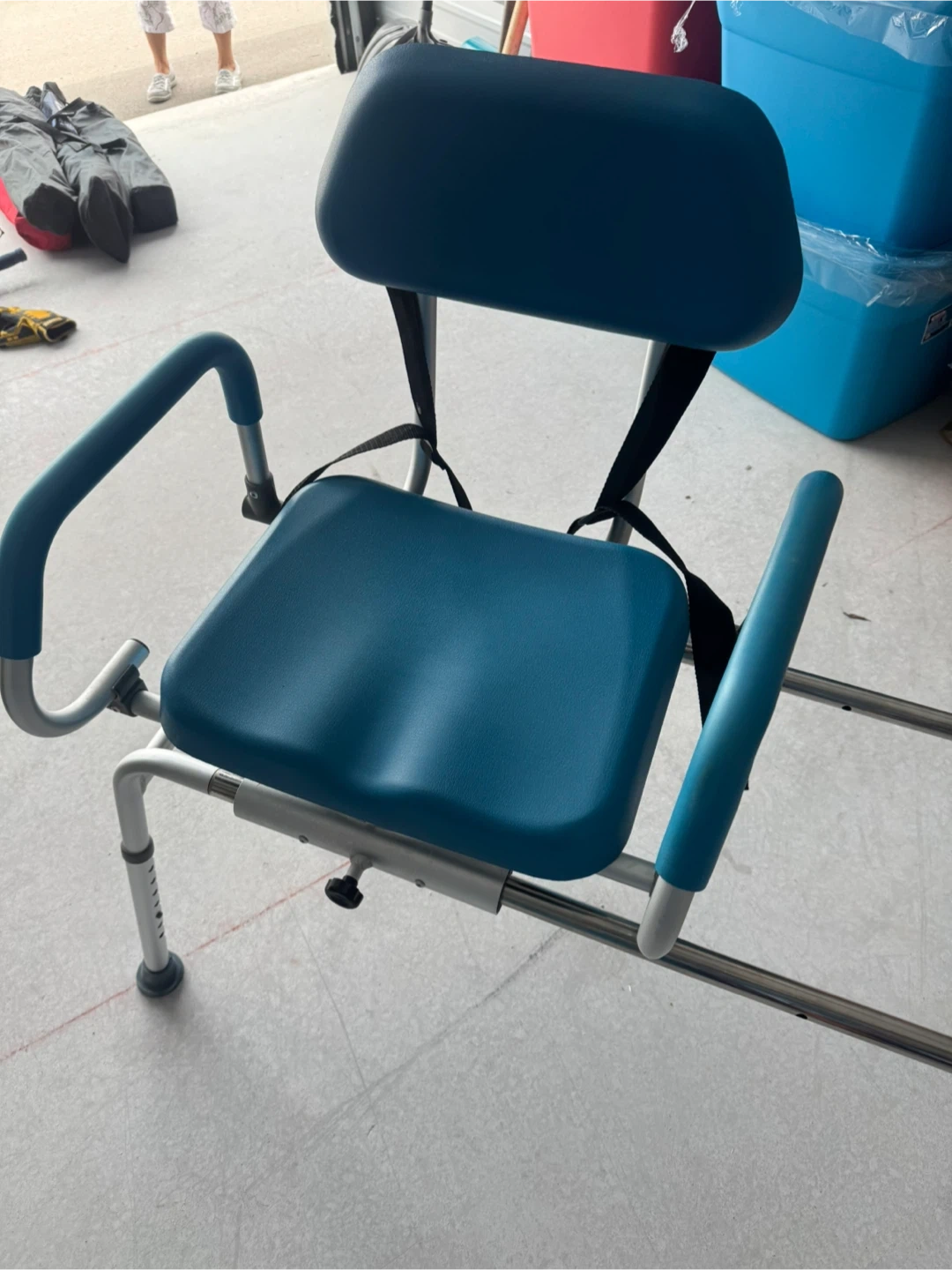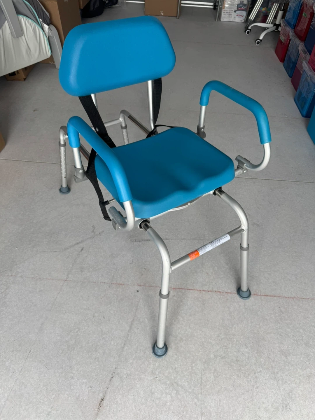 Great shower chair purchased for after my wife’s knee surgery. Padded seat, adjustable height legs and 360 degree rotation. Great for getting in and out of the shower. Super easy assembly/disassembly and use. NOTE: It does have a few rust marks on the bottom from being wet and the right arm locking piece is broken but doesn’t affect functionality at all (and in fact makes it easier to use) Also selling an adjustable height support for behind toilet that also functions as a walker. Chair retails for $200 new with tax.