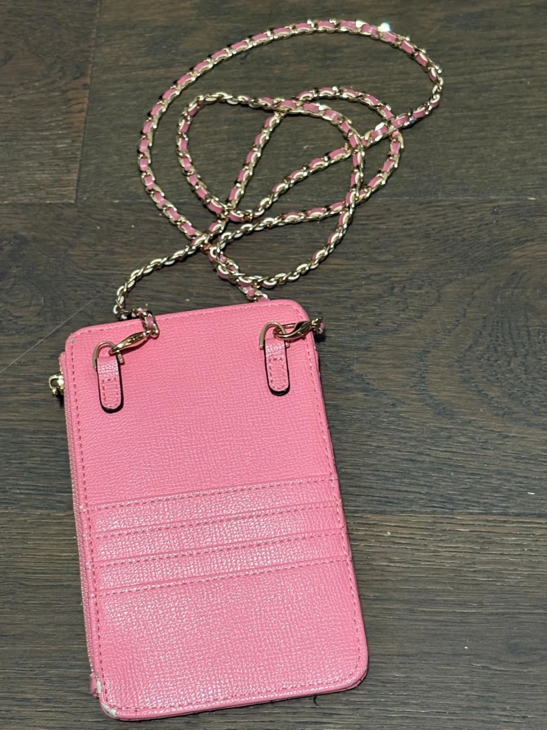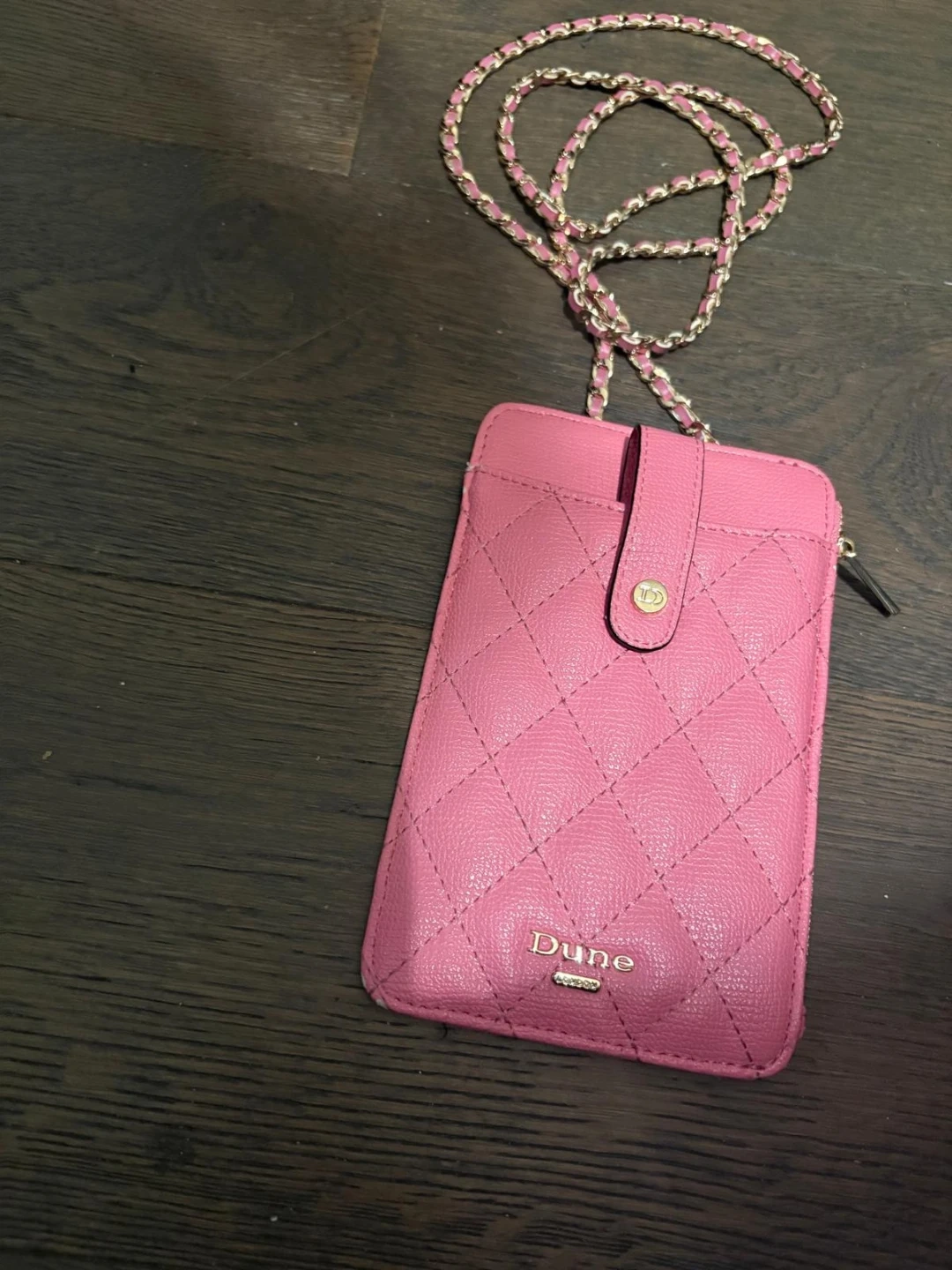 This Dune phone bag is a lovely pink colour and features a quilted design. It has a chain strap for easy carrying and multiple card slots on the back. Perfect for keeping your phone and essentials close by!