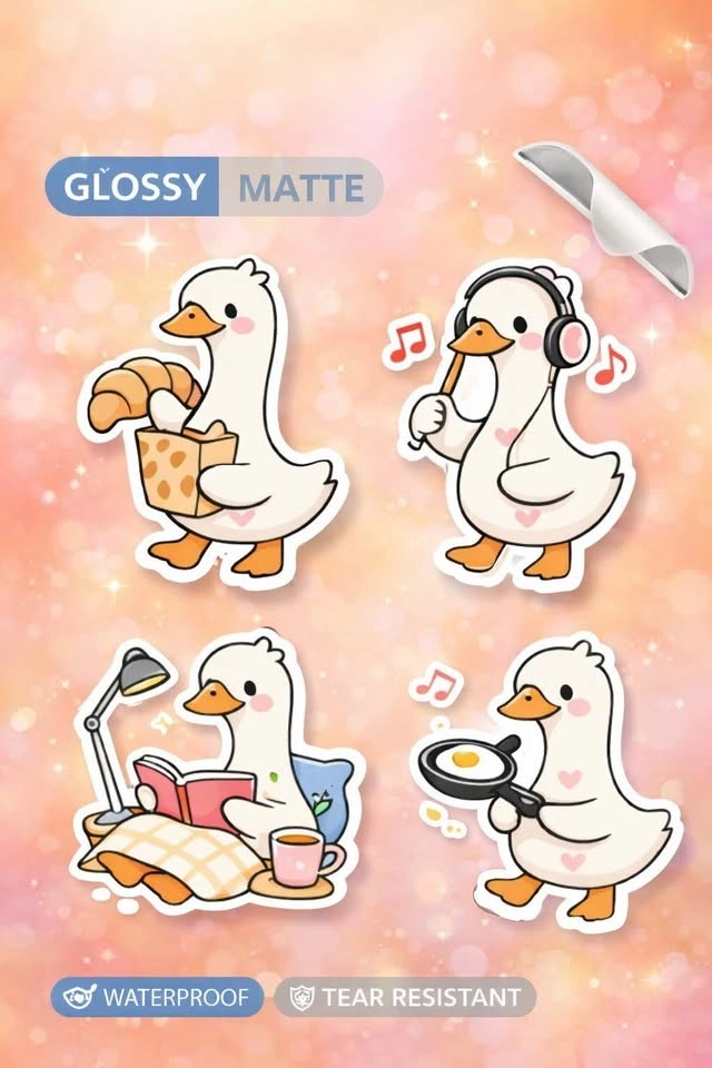 Adorable goose sticker set perfect for decorating laptops, water bottles, journals, planners, and more. Each sticker features a cute goose doing fun activities like baking, listening to music, reading, and cooking. Features: Waterproof, Tear resistant, High quality print, Die cut with white offset, Glossy or Matte finish available. Perfect for laptops, journals, planners, scrapbooks, and gifts. Let me know if you're interested!