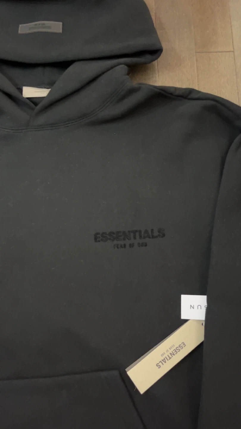 black/stretch limo Fear of God Essentials hoodie. hoodie is made of a soft material and has the Essentials logo printed on the front and back.